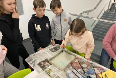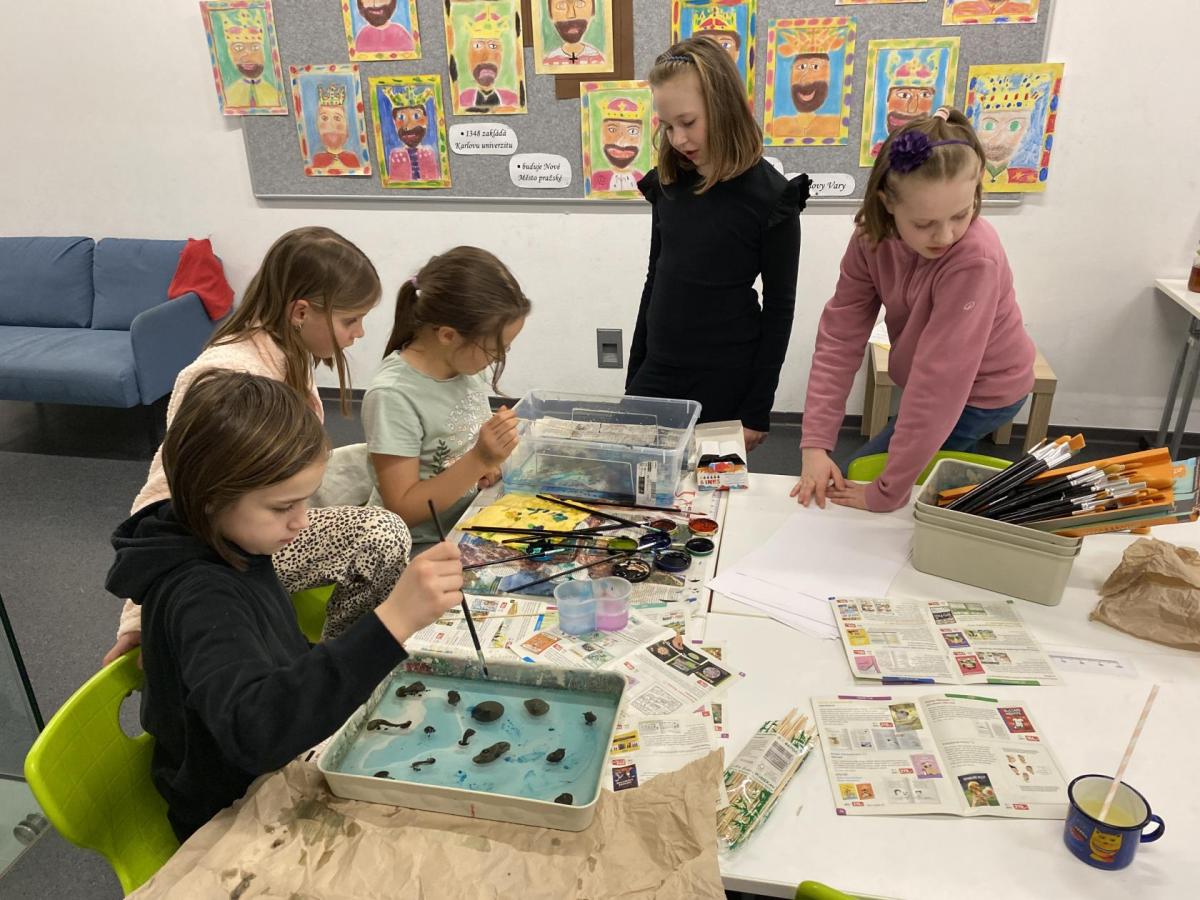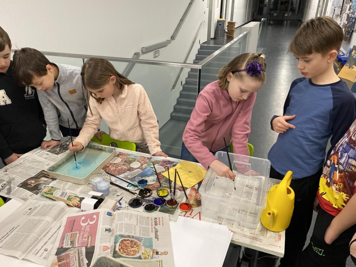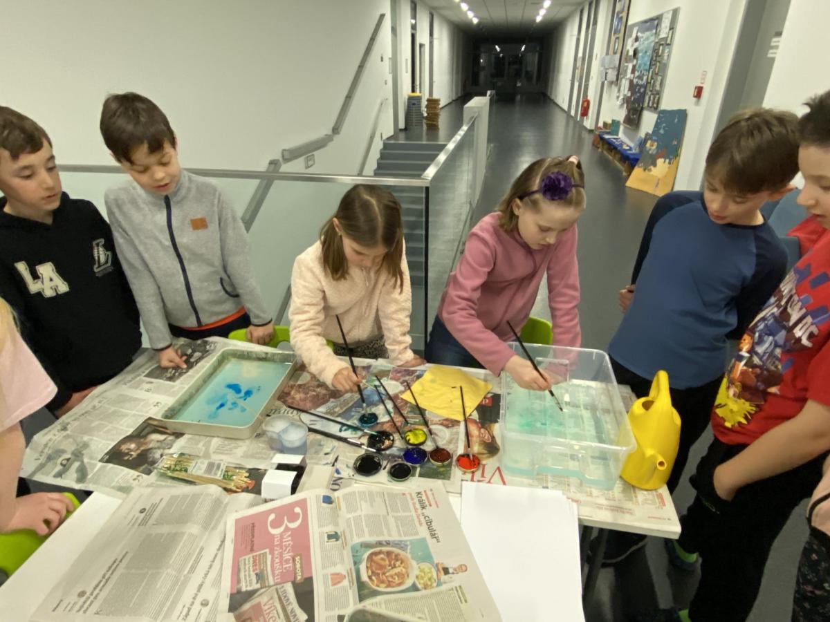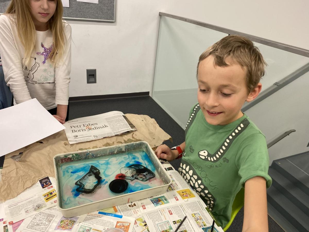 Po literární části jsme se pohodlně uvelebili a pustili si ukázku z filmu Jam utopit doktora Mráčka, která skvěle doplnila atmosféru celého setkání v knihovně. Smích a napětí se střídaly a nikomu se nechtělo od obrazovky odtrhnout. Přesto jsme se museli s paní Vidovou rozloučit a vrátit se do školy, kde jsme se věnovali pro změnu výtvarným a uměleckým činnostem. Vyzkoušeli jsme si japonskou techniku zvanou suminagashi, při které jsme vytvářeli jemné barevné vzory na vodní hladině. Později z nich vyrobíme pozvánky pro rodiče na naše divadelní představení. Těšíme se, že každá pozvánka bude originálem a zároveň malým uměleckým dílem.