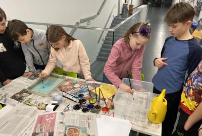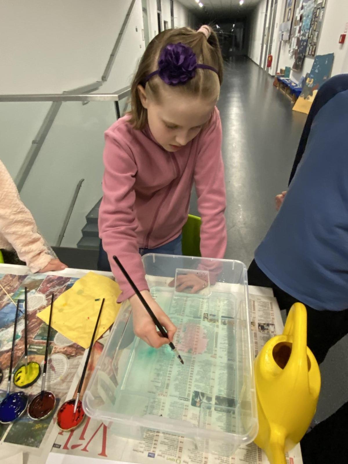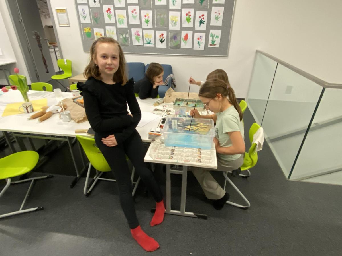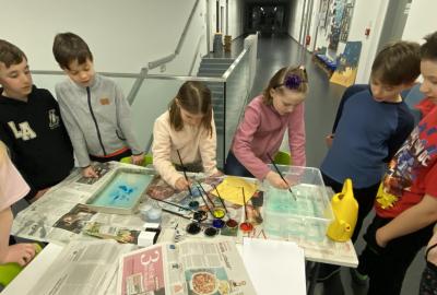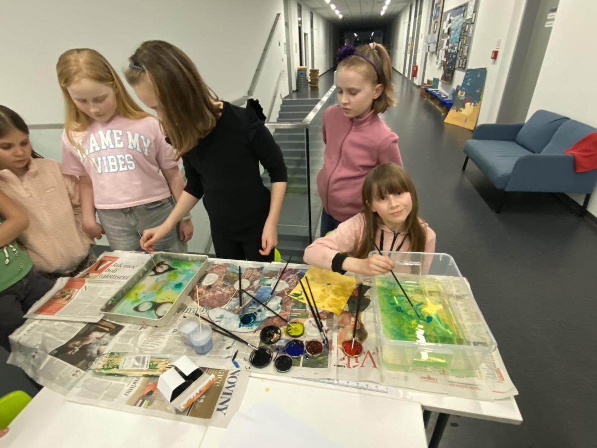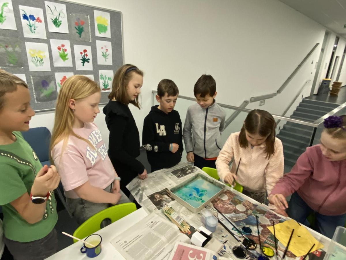 Po literární části jsme se pohodlně uvelebili a pustili si ukázku z filmu Jam utopit doktora Mráčka, která skvěle doplnila atmosféru celého setkání v knihovně. Smích a napětí se střídaly a nikomu se nechtělo od obrazovky odtrhnout. Přesto jsme se museli s paní Vidovou rozloučit a vrátit se do školy, kde jsme se věnovali pro změnu výtvarným a uměleckým činnostem. Vyzkoušeli jsme si japonskou techniku zvanou suminagashi, při které jsme vytvářeli jemné barevné vzory na vodní hladině. Později z nich vyrobíme pozvánky pro rodiče na naše divadelní představení. Těšíme se, že každá pozvánka bude originálem a zároveň malým uměleckým dílem.