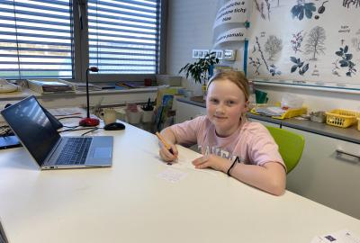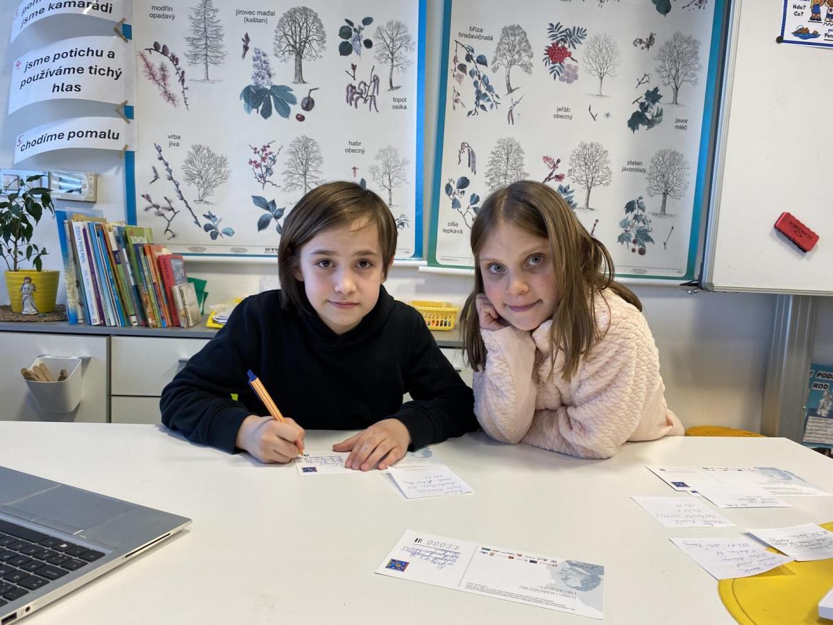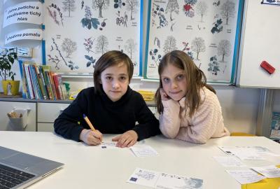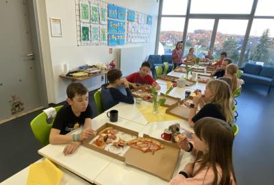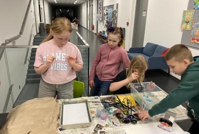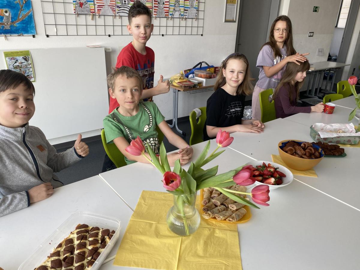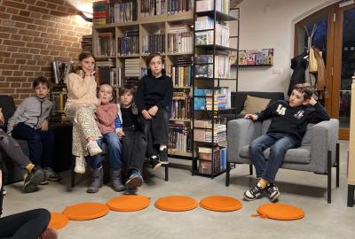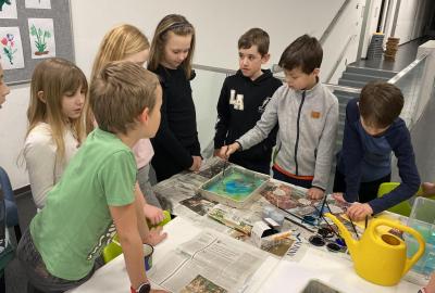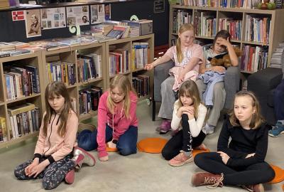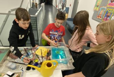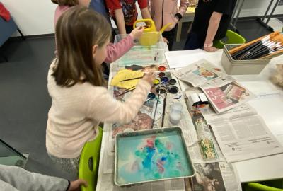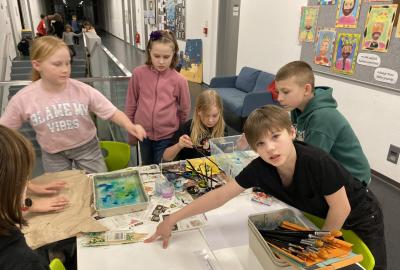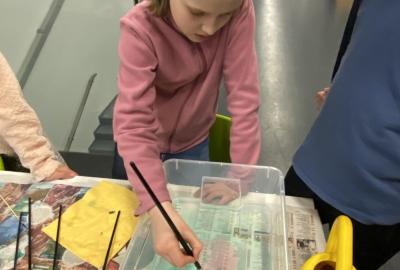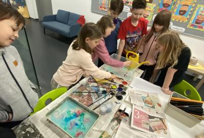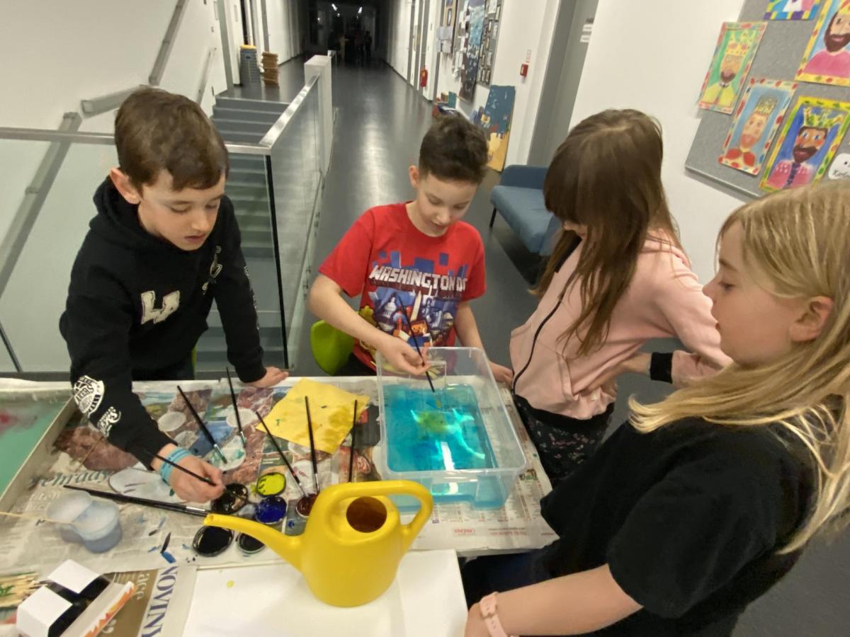 Po literární části jsme se pohodlně uvelebili a pustili si ukázku z filmu Jam utopit doktora Mráčka, která skvěle doplnila atmosféru celého setkání v knihovně. Smích a napětí se střídaly a nikomu se nechtělo od obrazovky odtrhnout. Přesto jsme se museli s paní Vidovou rozloučit a vrátit se do školy, kde jsme se věnovali pro změnu výtvarným a uměleckým činnostem. Vyzkoušeli jsme si japonskou techniku zvanou suminagashi, při které jsme vytvářeli jemné barevné vzory na vodní hladině. Později z nich vyrobíme pozvánky pro rodiče na naše divadelní představení. Těšíme se, že každá pozvánka bude originálem a zároveň malým uměleckým dílem.