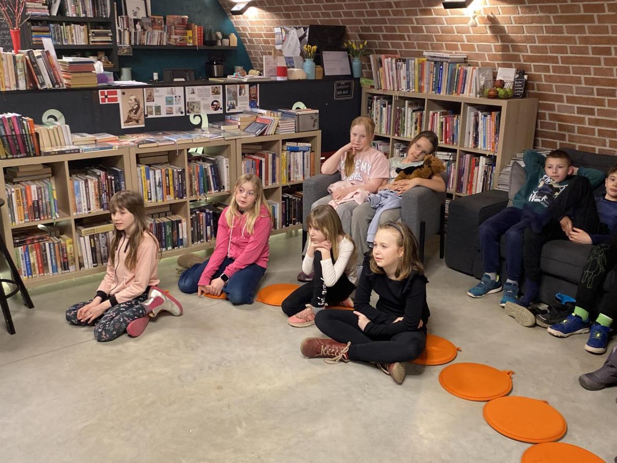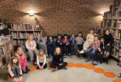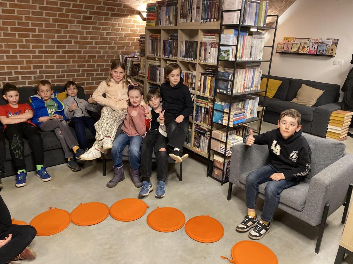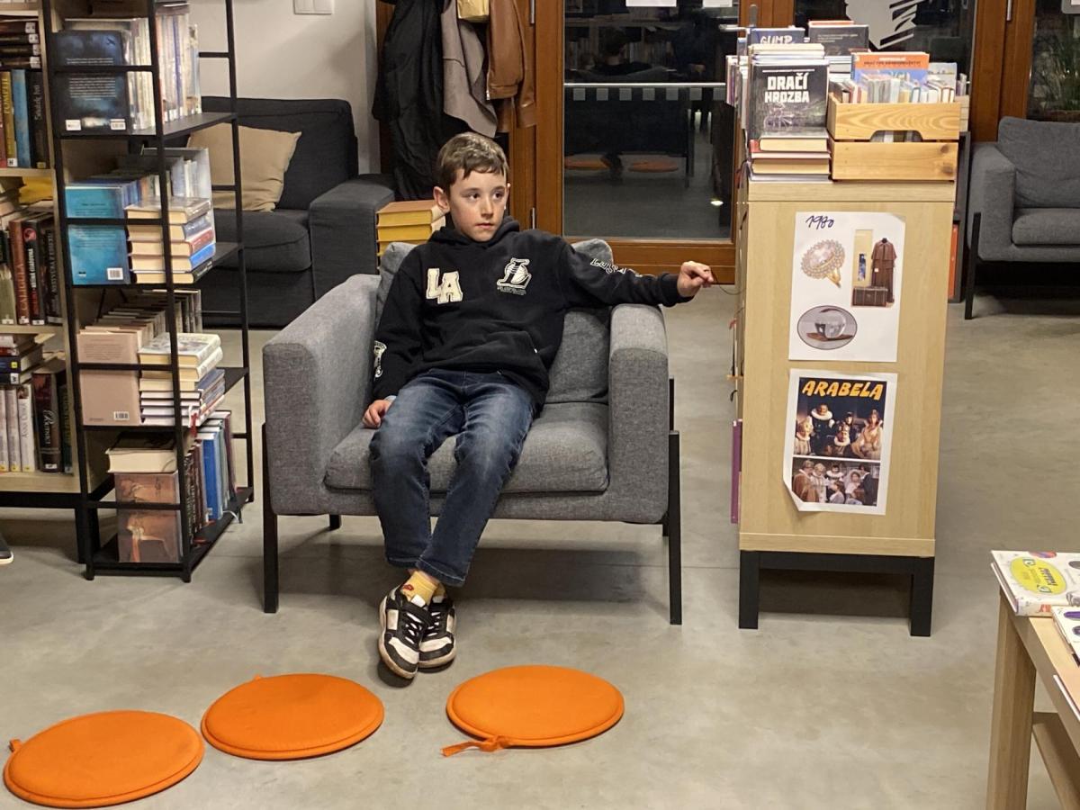Hlavní část programu se odehrála v knihovně, která se na tu noc, díky naší skvělé knihovnici paní Vidové, proměnila v kouzelné místo plné pohádek, ilustrací a příběhů. Usadili jsme se mezi regály s knihami a poslouchali vyprávění o panu Miloši Macourkovi, Adolfu Bornovi i Petru Nárožném. Jejich skvělé umění nás vtáhlo do světa fantazie, humoru a nečakaných nápadů. Povídali jsme si o tvorbě pana Macourka, o postavách z jeho knížek i o tom, jak dokázal obyčejné věci proměnit v neobyčejné.