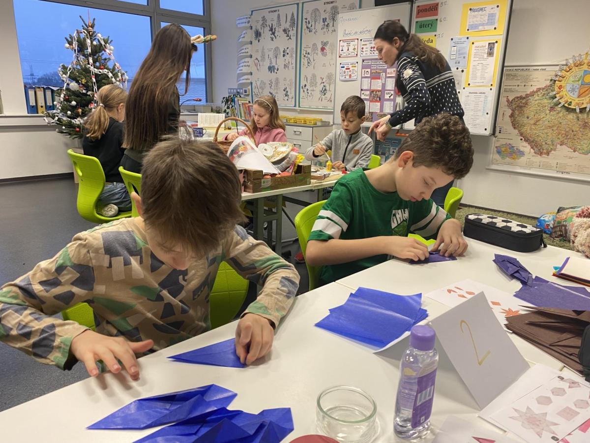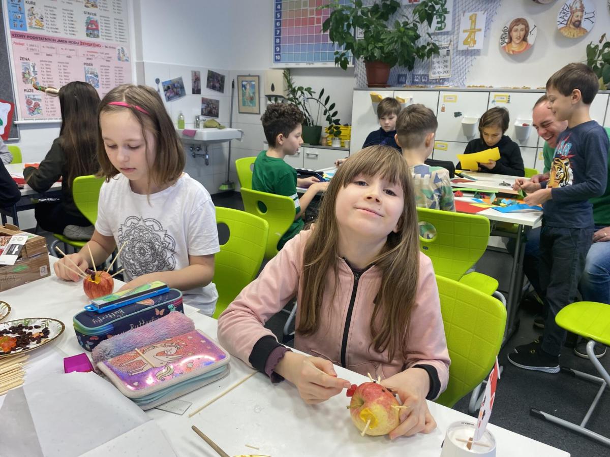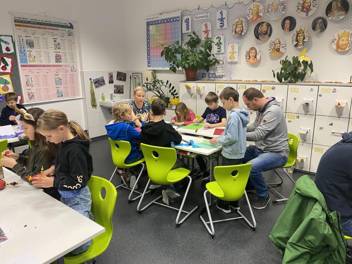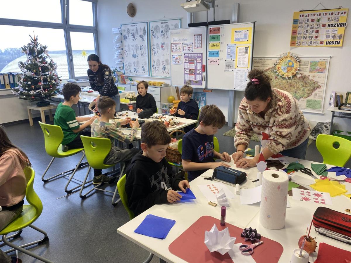 Jak to už s těmi tradicemi bývá, tato tvořivá, patří u nás ve třídě k nejoblíbenějším! Každý rok se těšíme, kdy za námi přijdou naši rodiče na celé dopoledne a na jakém krásném výrobku s nimi budeme pracovat. Maminka našeho Péti, za vydatné pomoci Sebíkova taťky, nás naučila skládat pohyblivý ornament z kartonu. V dílničce, kterou již tradičně vedli tatínkové Vojtíka a Matěje, jsme si vyrobili sněhuláčka z papírových kelímků. Každé vánoční období za námi do dílniček chodí také Zarinčina maminka, a vždy s sebou přinese nějaký neobvyklý nápad. Tentokrát to byla skládaná hvězda na okno z hedvábných papírů. Voňavou dílničkou nás provedla maminka naší Evelínky, protože jsme zde tvořili krásné svícky z jablíček a různým dalších dobrůtek. A ten, kdo byl při vyrábění svícnu rychlejší, si mohl ještě ozdobit kartonová srdíčka a kouličky ubrouskovou technikou. Všechny dílničky jsme si vážně moc a moc užili a výrobky se povedly nad očekávání. Naši kreativitu ocenila i paní ředitelka, která se zastavila na malou tvořivou ochutnávku. Čtyři dopolední hodiny plné nadšení, úsměvů, pohody a vánoční nálady uběhly jako mávnutím kouzelného proutku a my jsme se našimi maminkami a tatínky museli rozloučit. Poděkovali jsme jim bouřlivým potleskem a paní učitelka ještě s mrknutím oka přidala, že už se těší na Velikonoce. Určitě si zase něco hezkého vyrobíme. Tak moc a moc děkujeme a jsme vážně rádi, že vás to s námi stále baví!