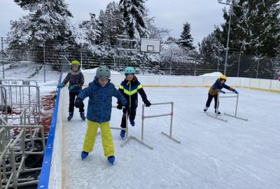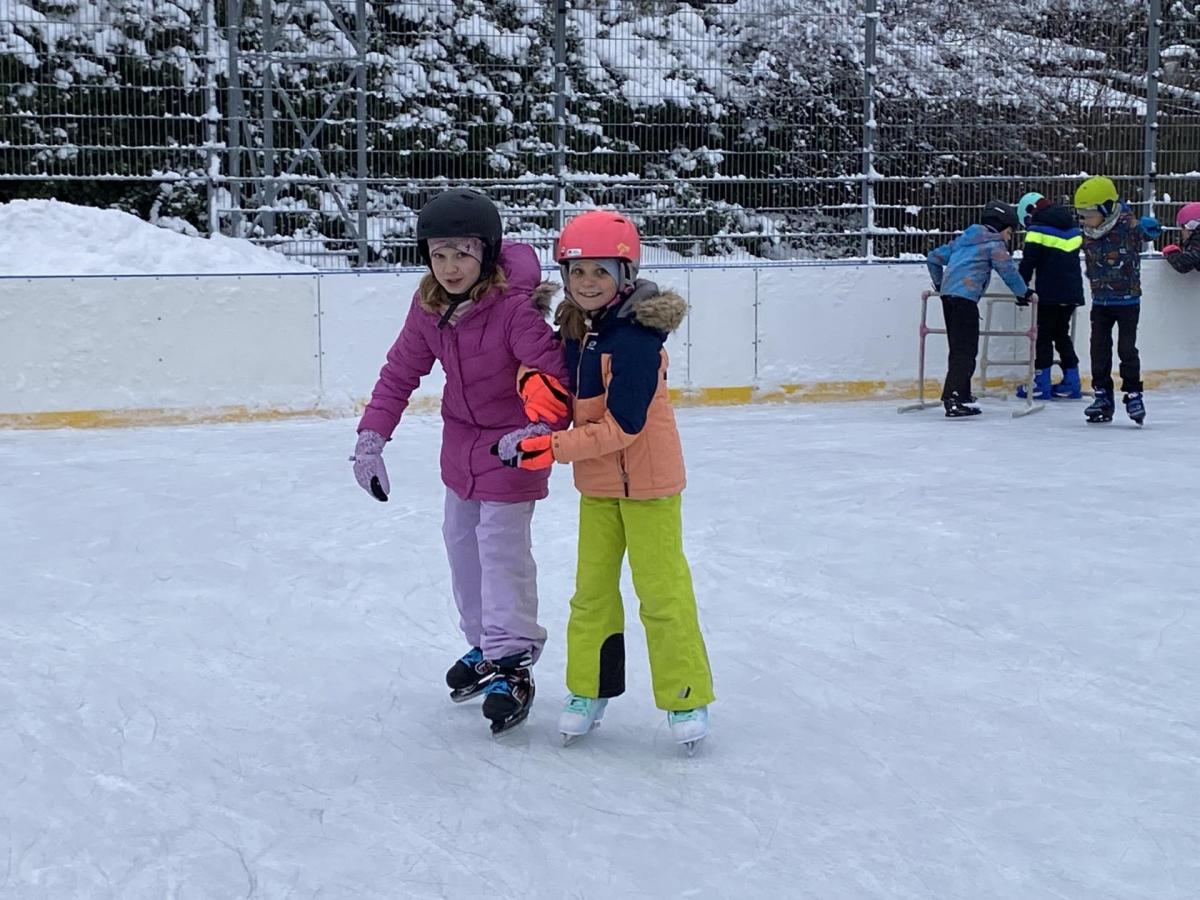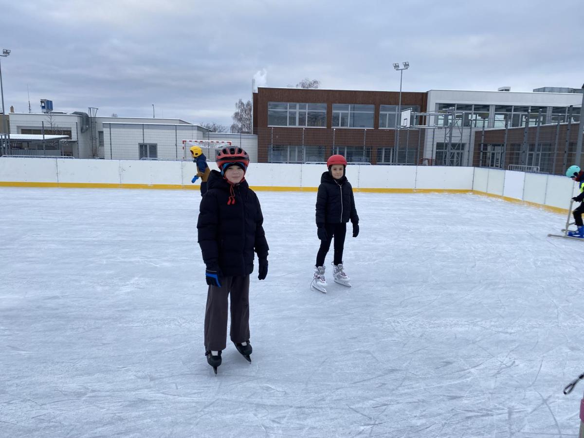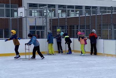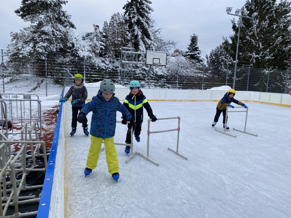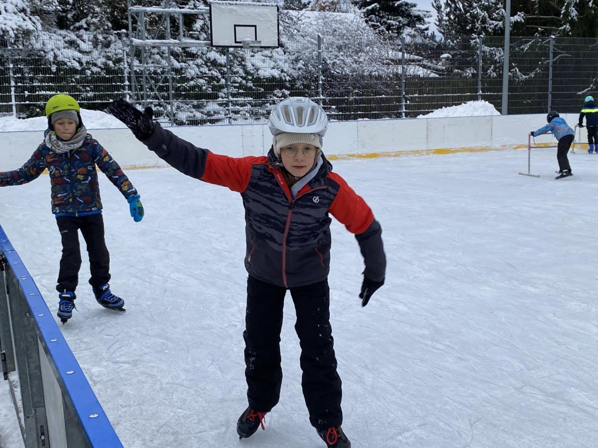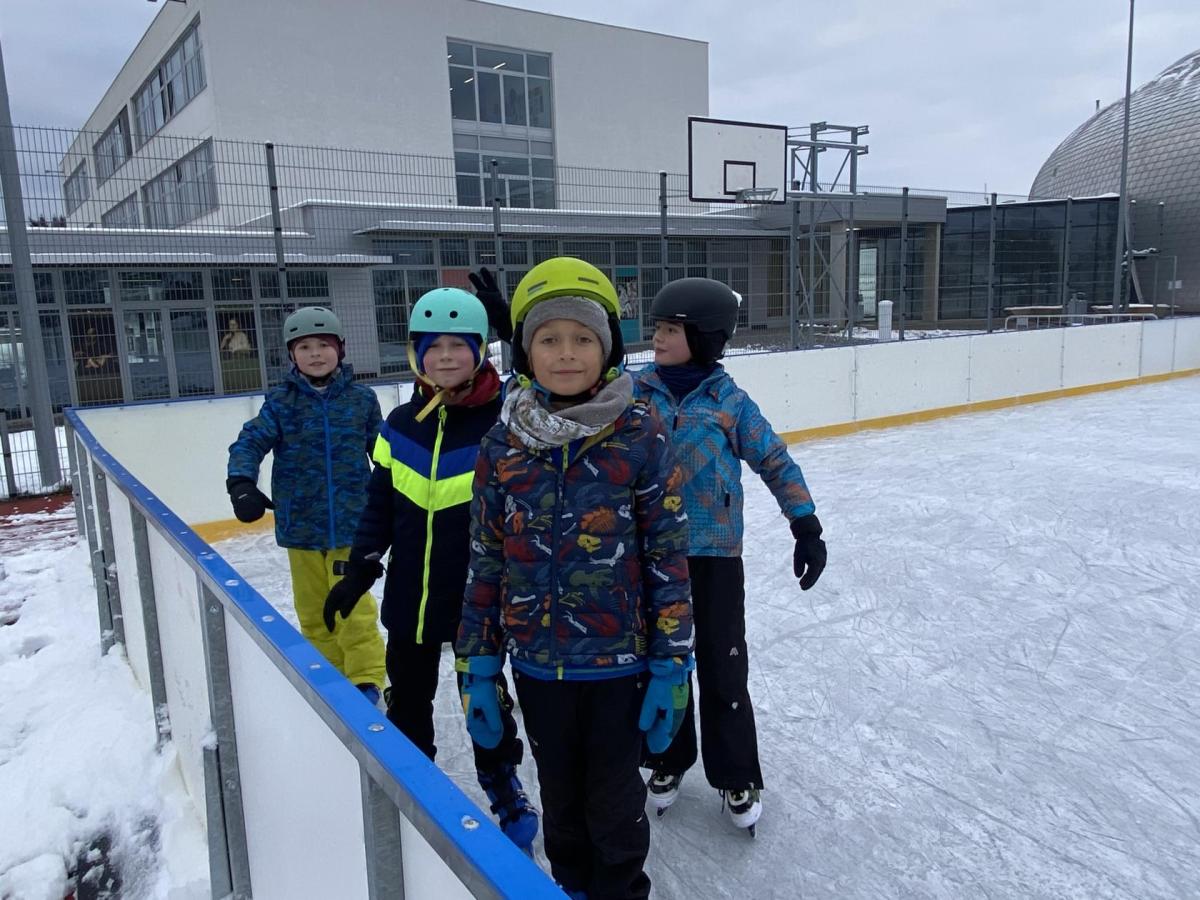 Část víceúčelového hřiště u školy se proměnila v kluziště, takže naše bruslařská výzbroj rozhodně nemohla zahálet.