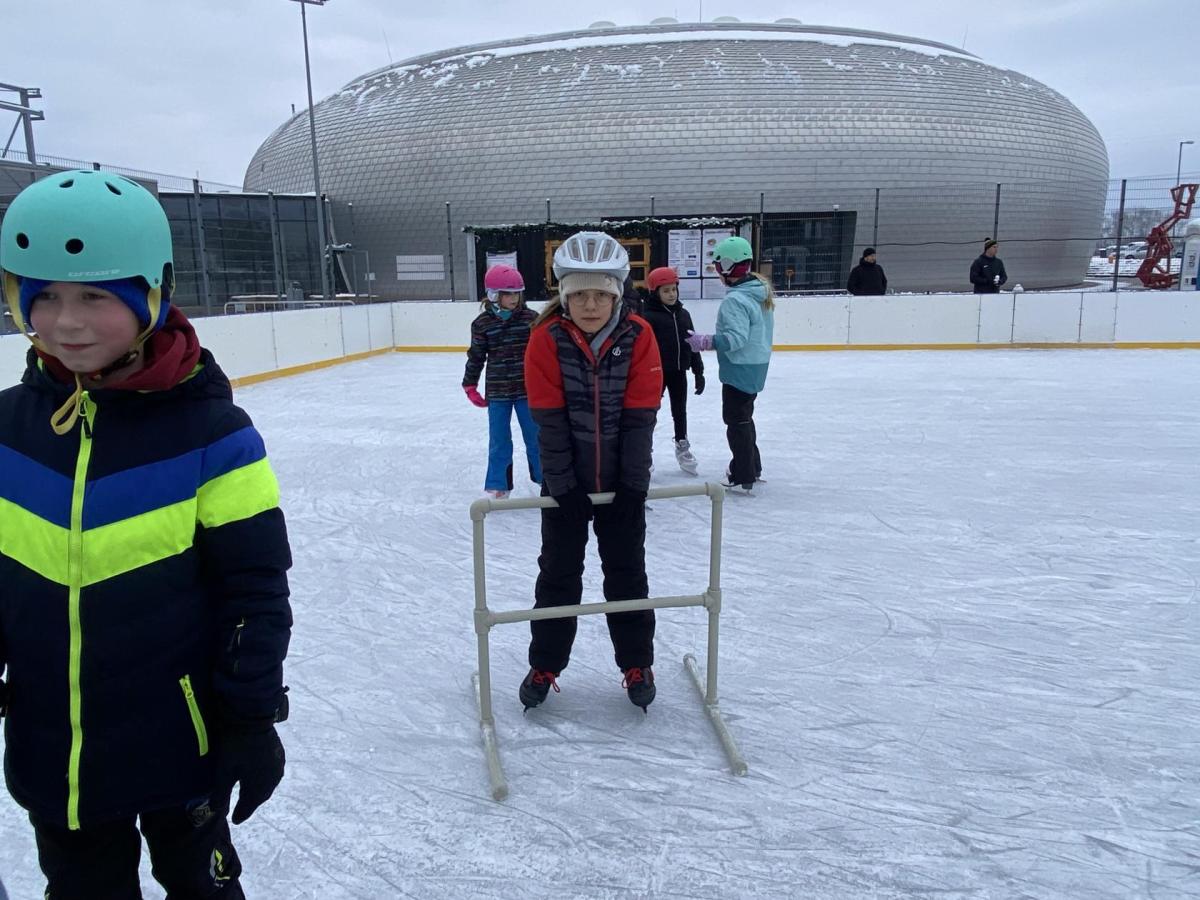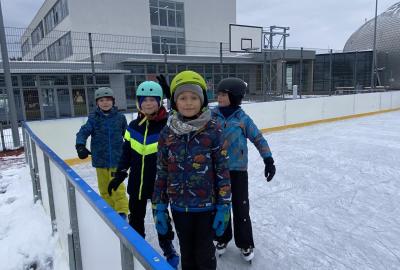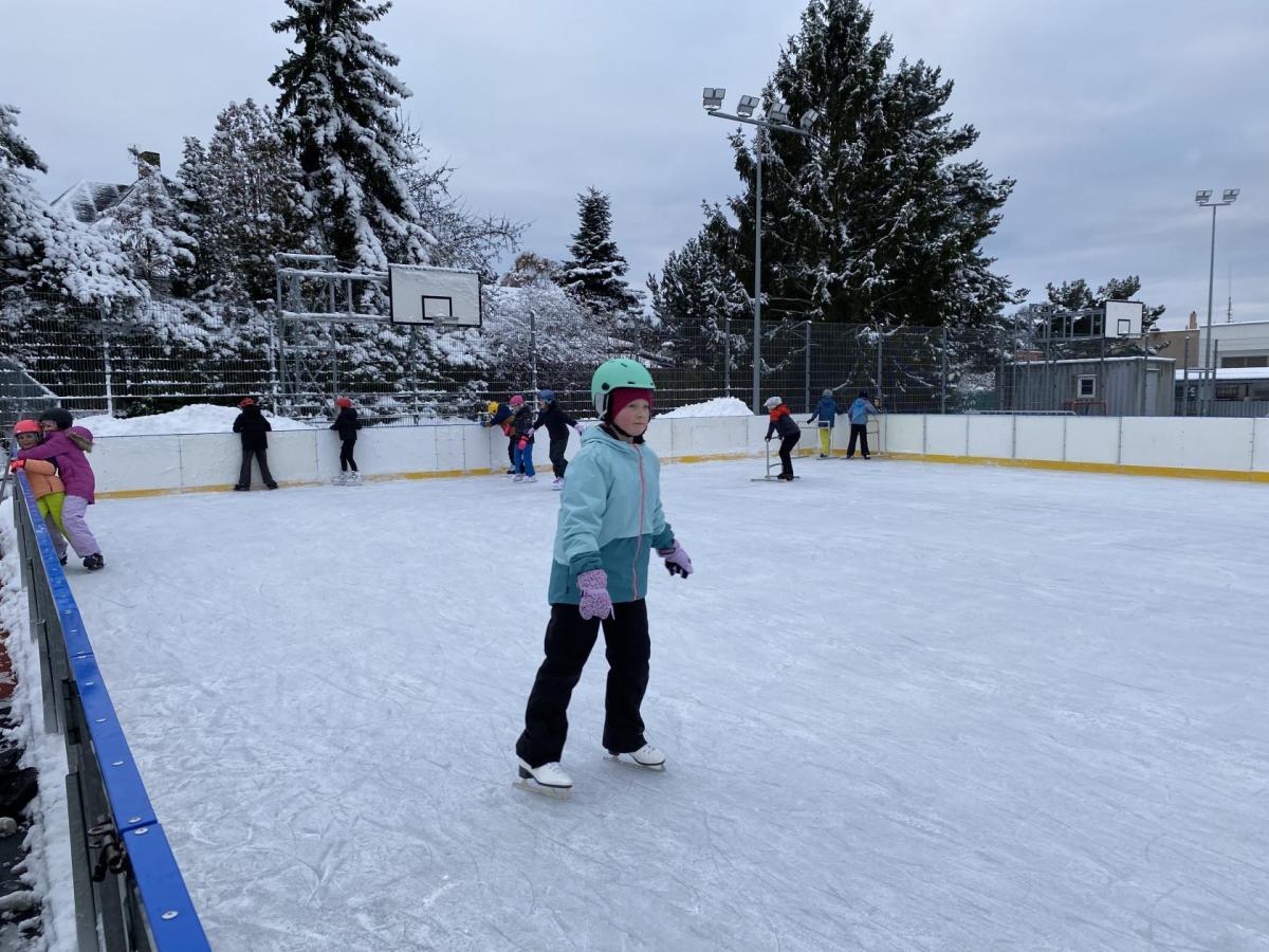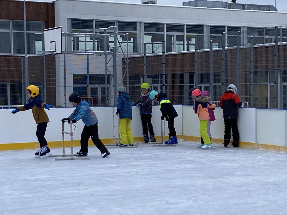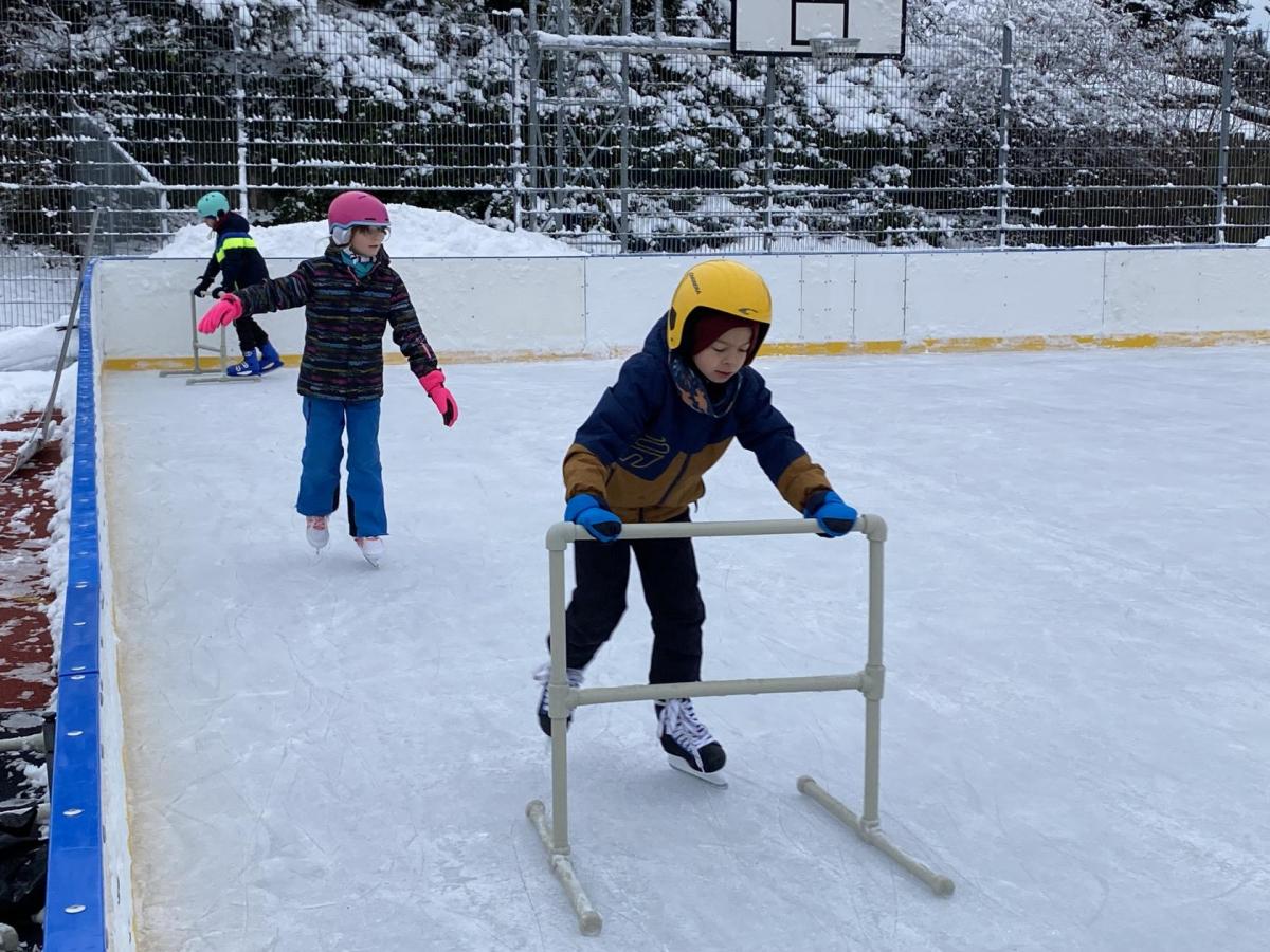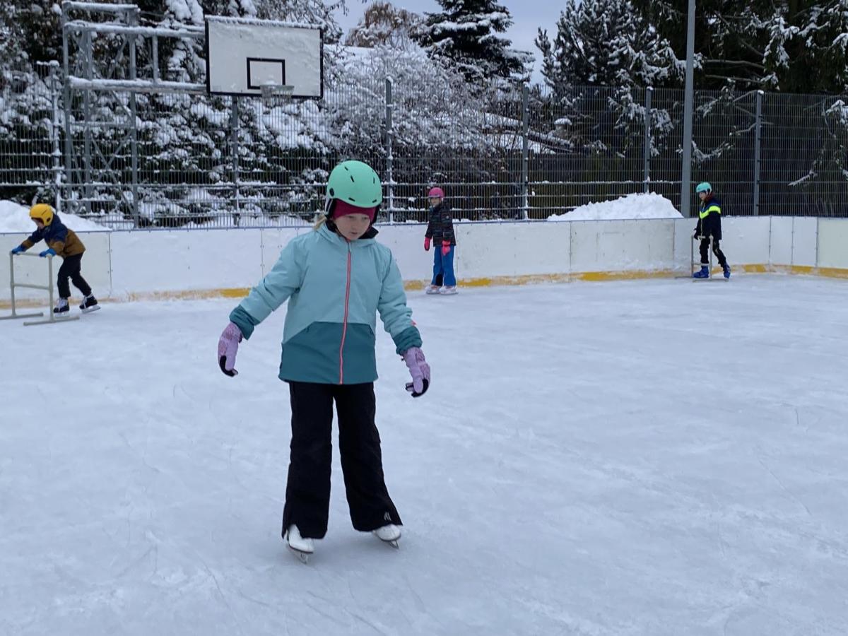 Část víceúčelového hřiště u školy se proměnila v kluziště, takže naše bruslařská výzbroj rozhodně nemohla zahálet.
