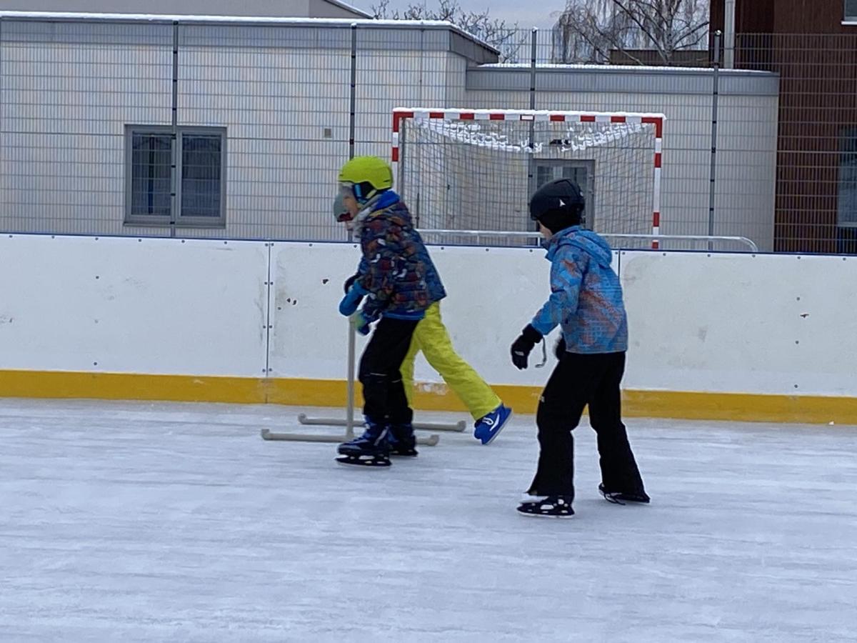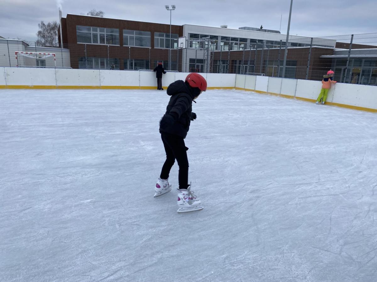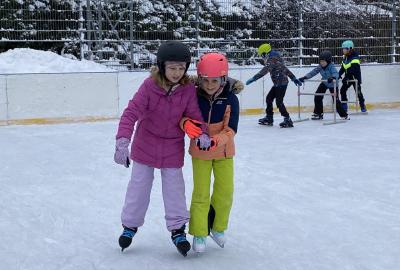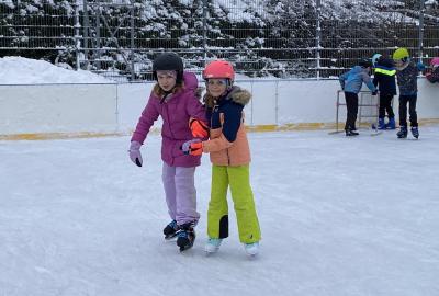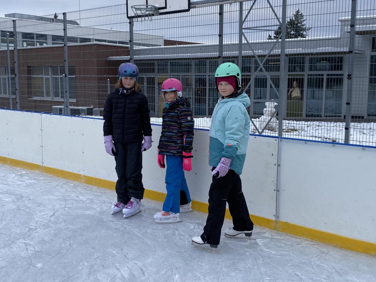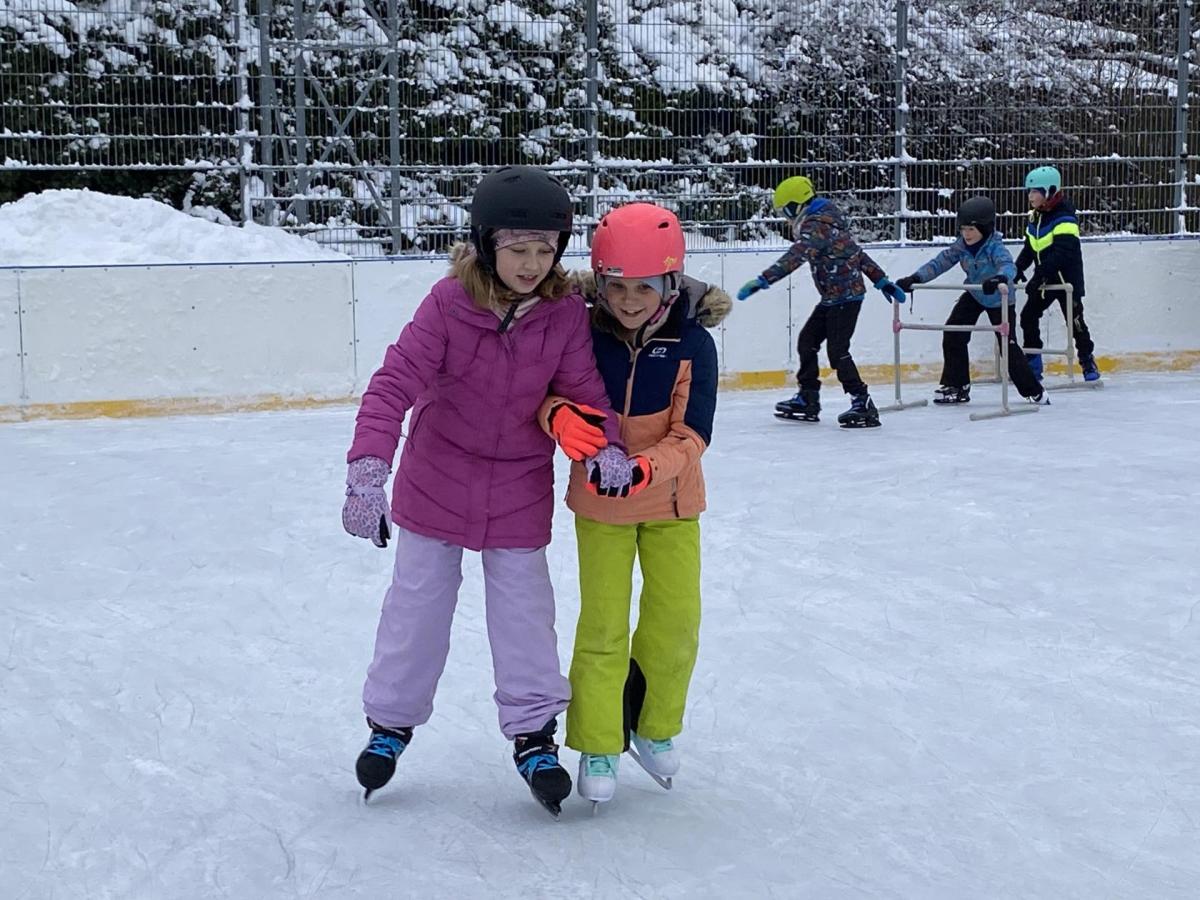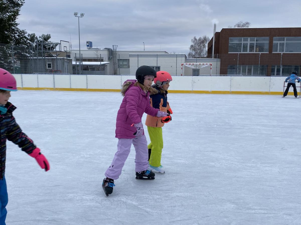 Část víceúčelového hřiště u školy se proměnila v kluziště, takže naše bruslařská výzbroj rozhodně nemohla zahálet.