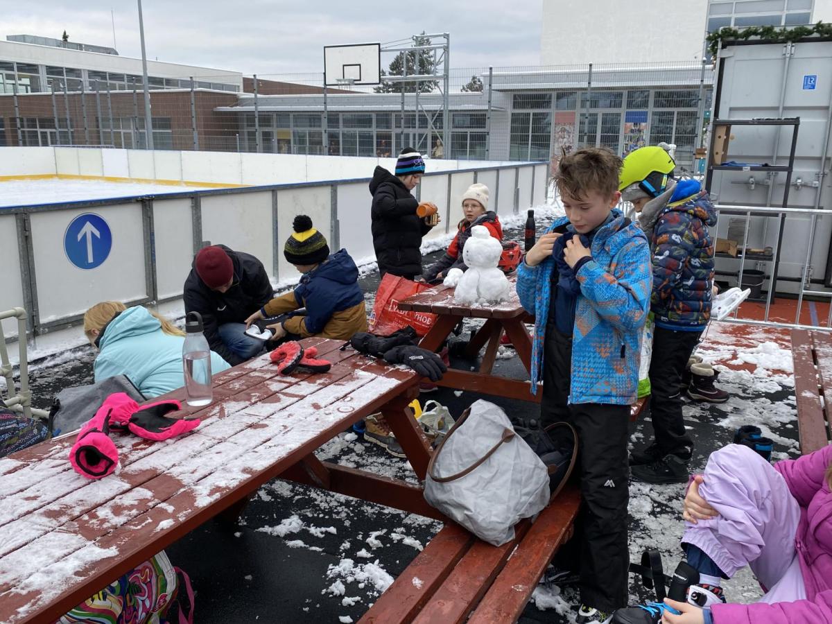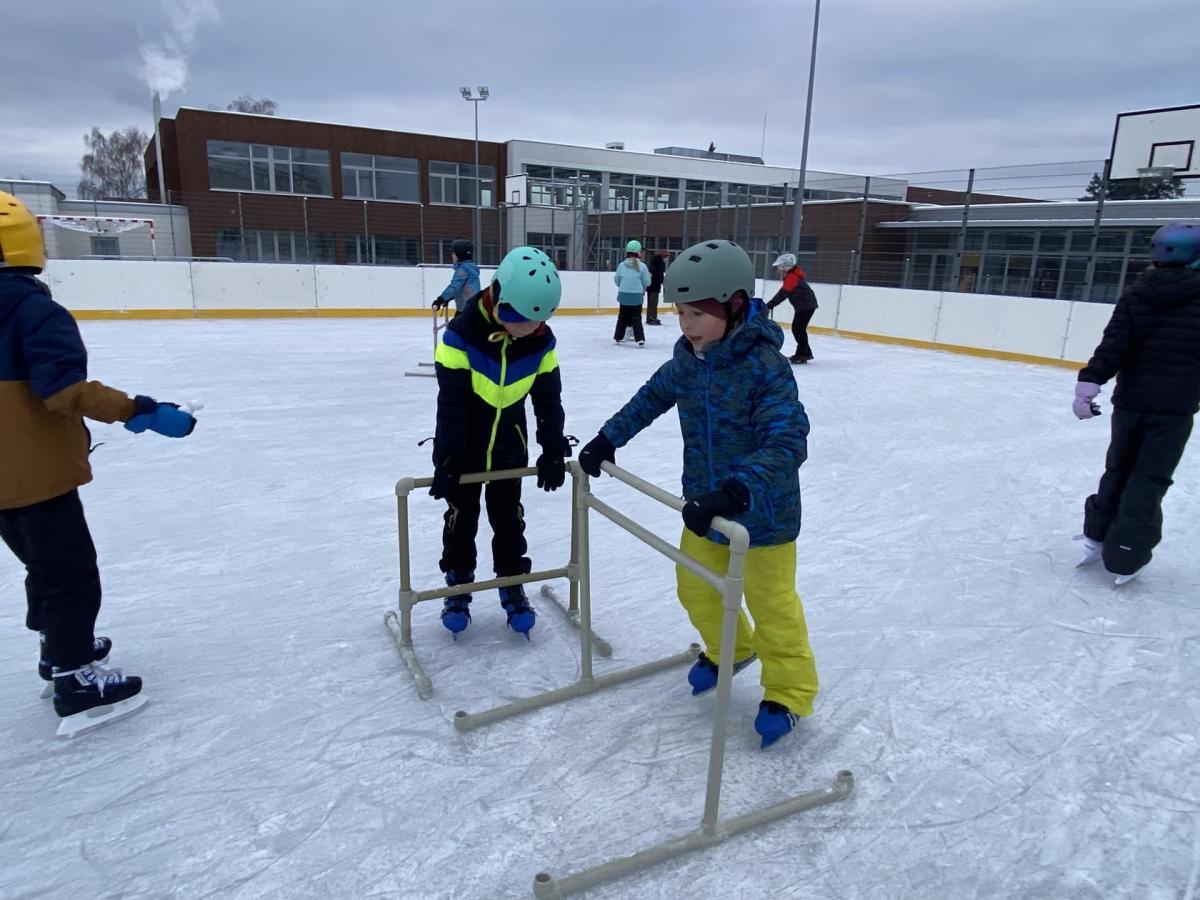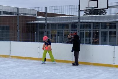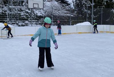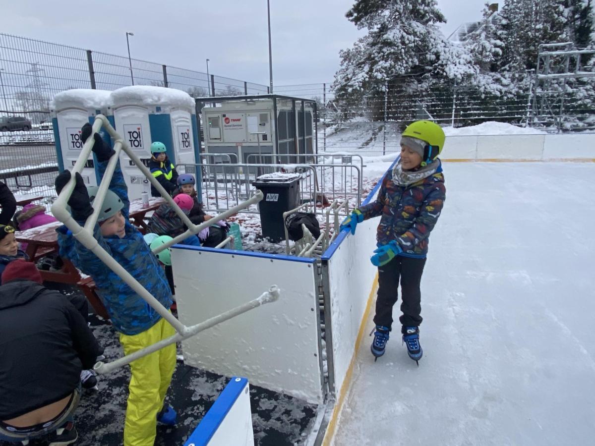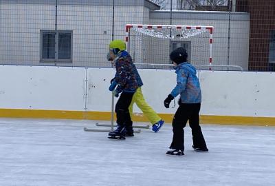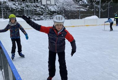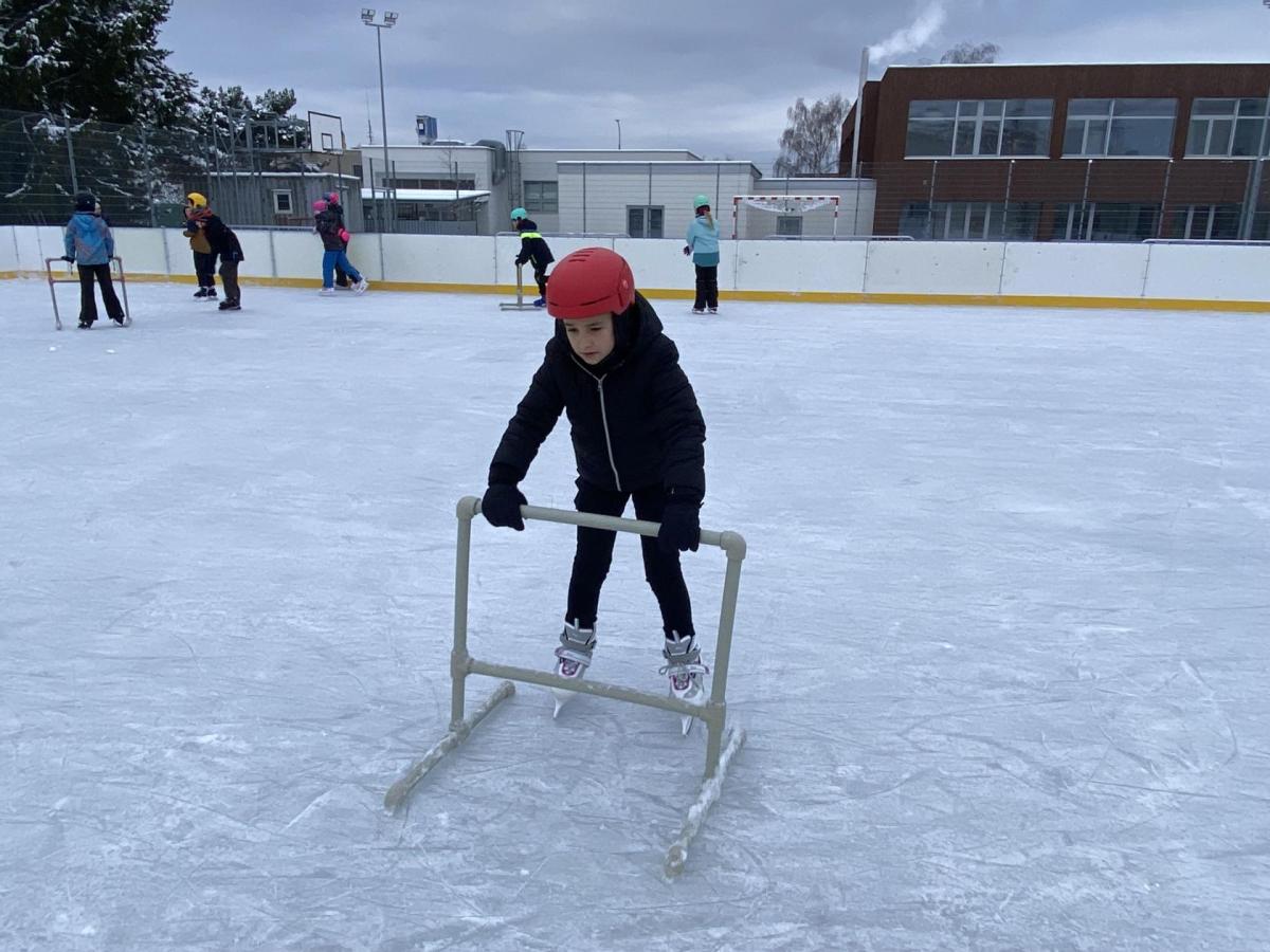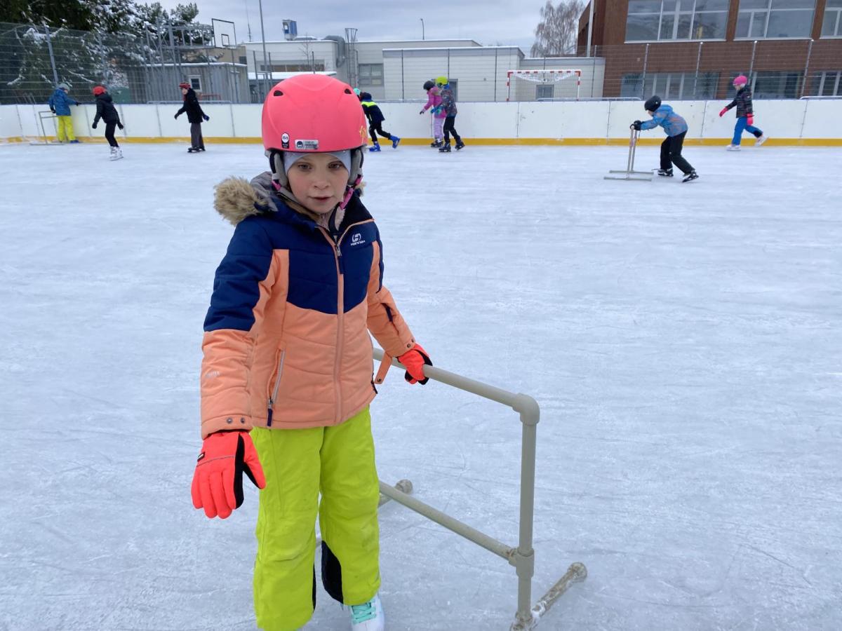 Část víceúčelového hřiště u školy se proměnila v kluziště, takže naše bruslařská výzbroj rozhodně nemohla zahálet.