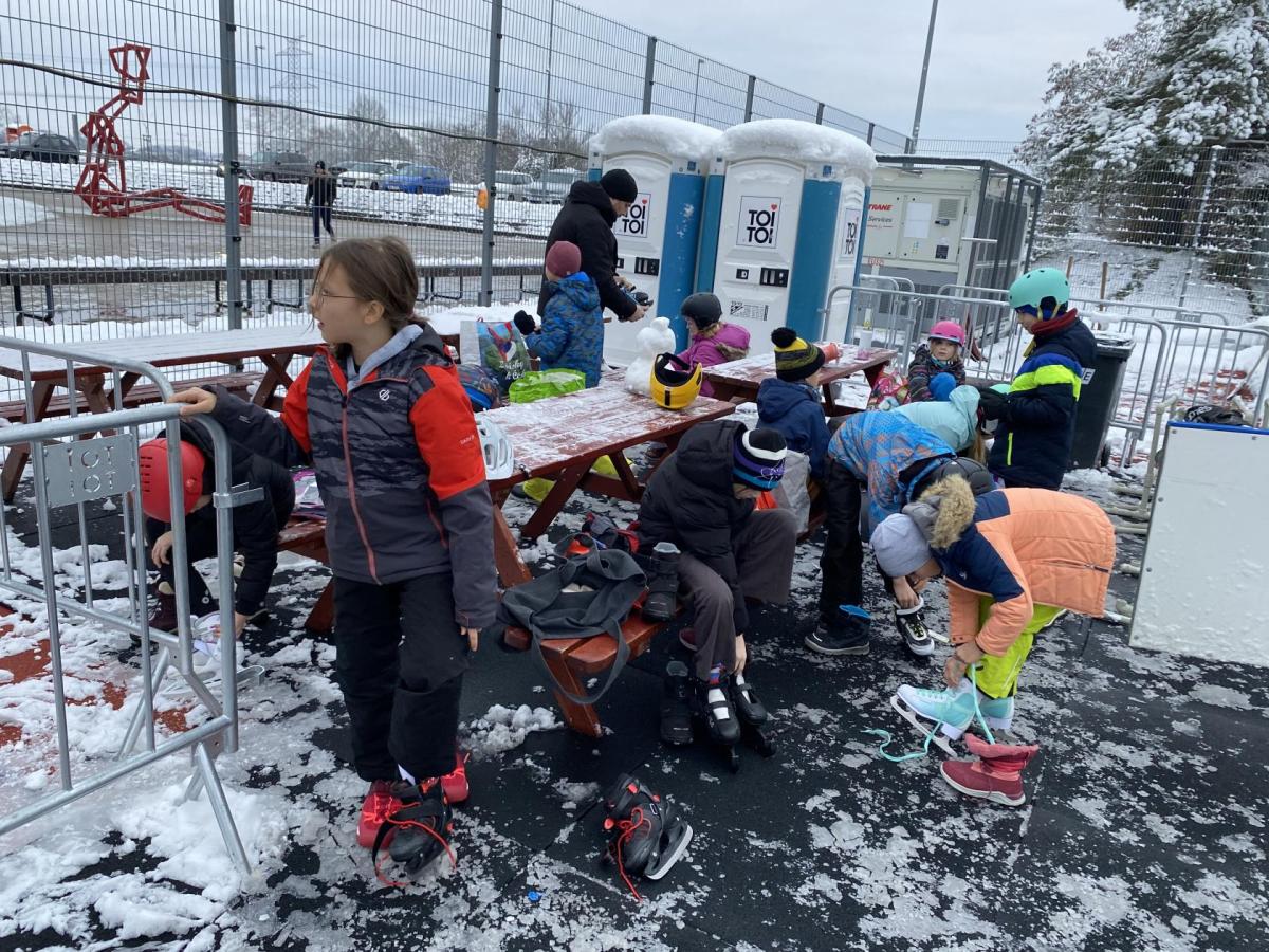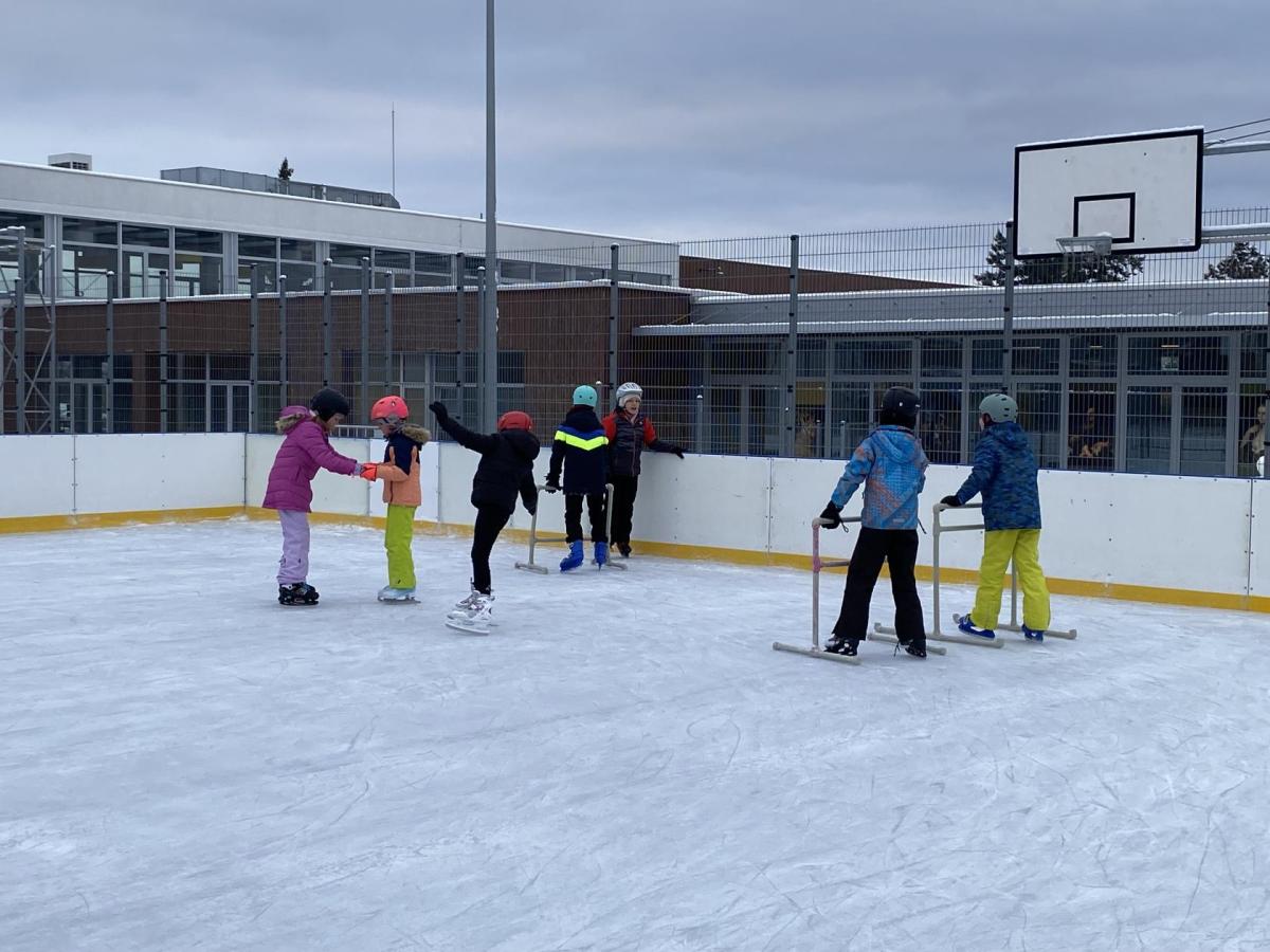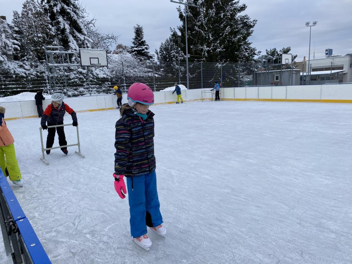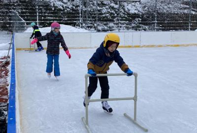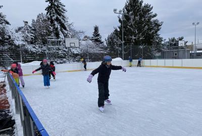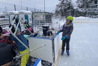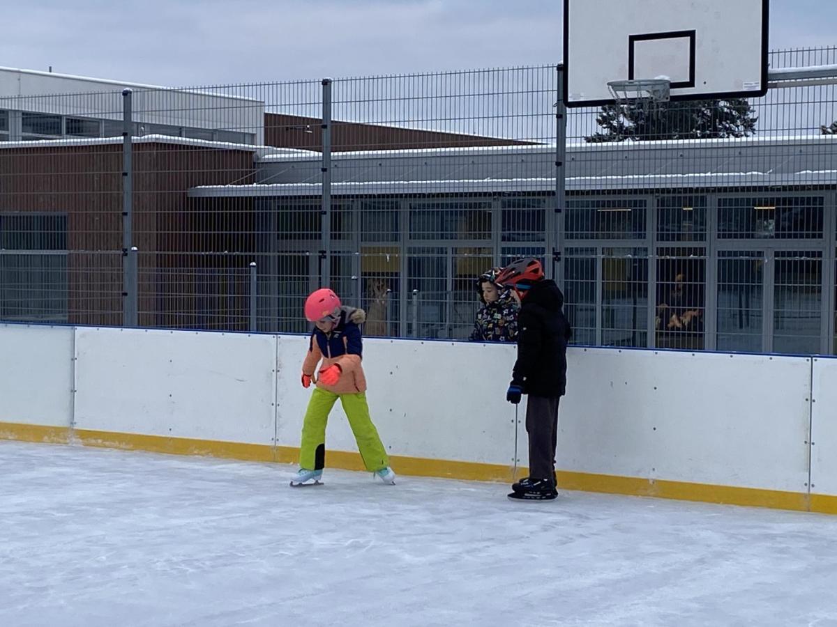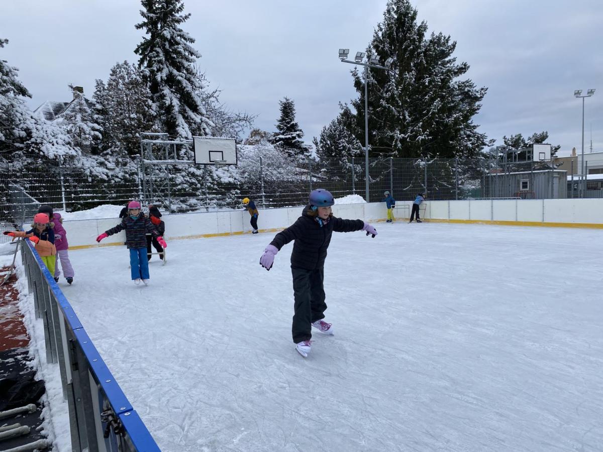 Část víceúčelového hřiště u školy se proměnila v kluziště, takže naše bruslařská výzbroj rozhodně nemohla zahálet.