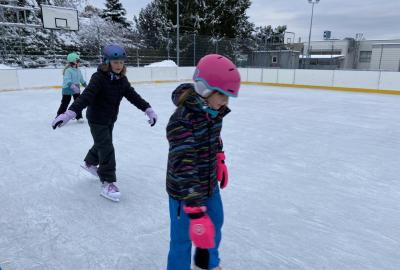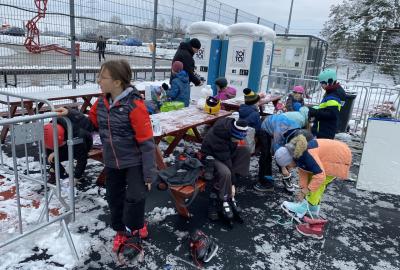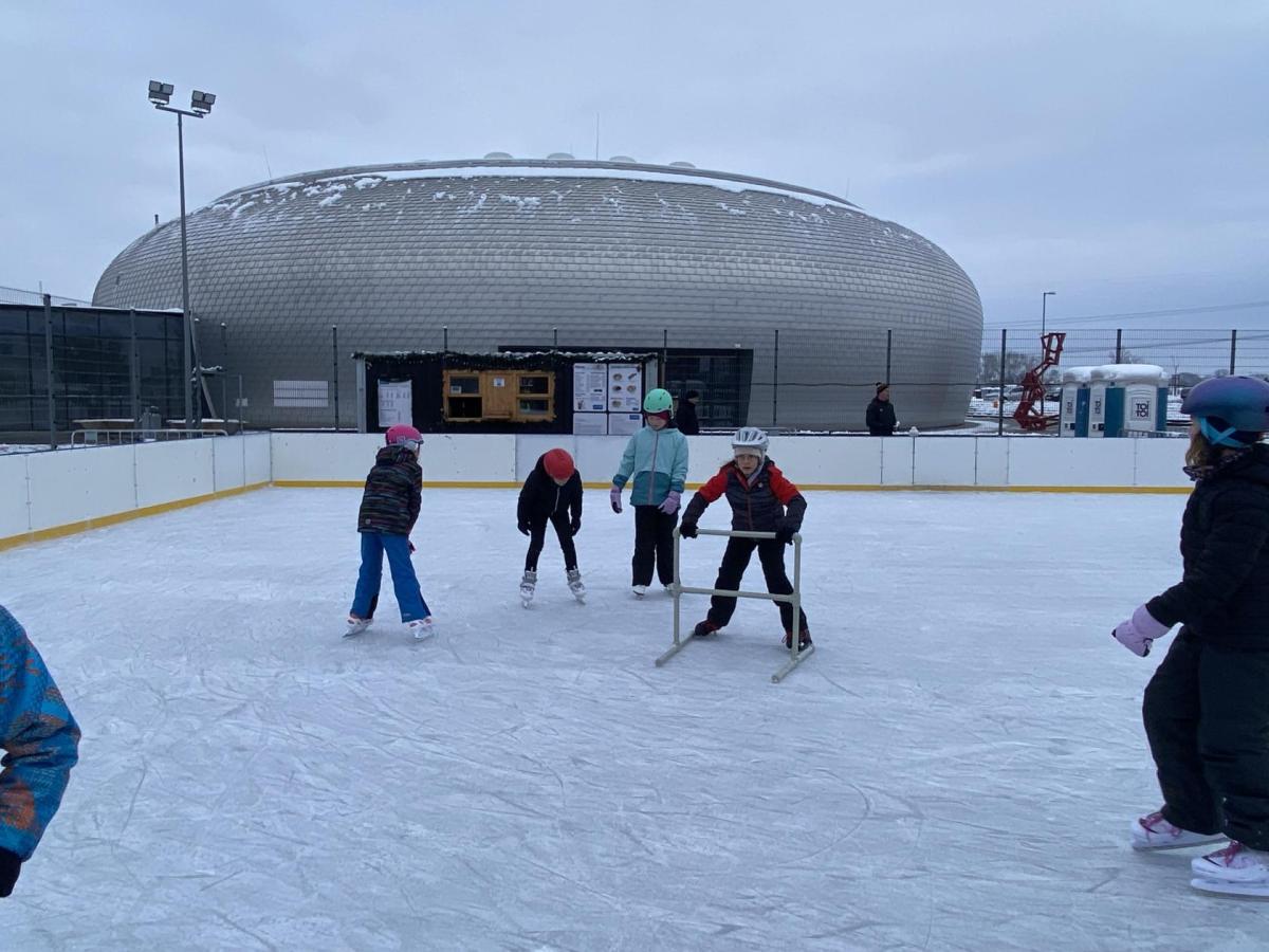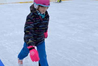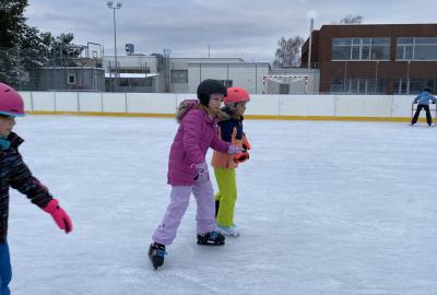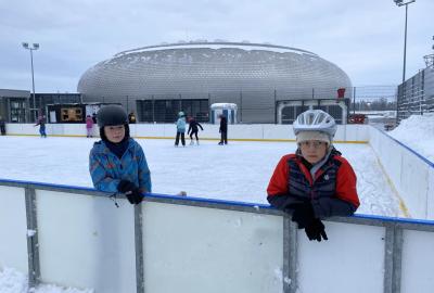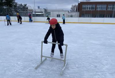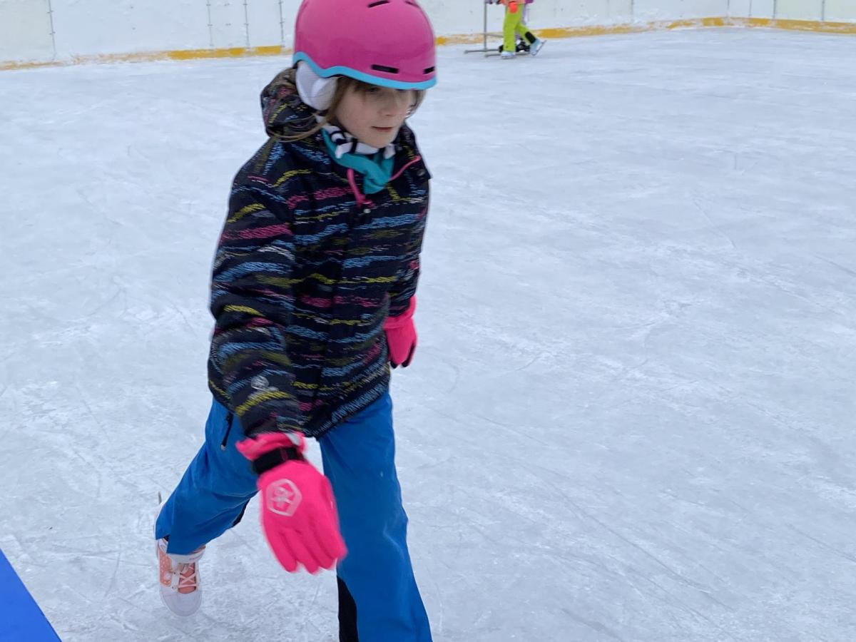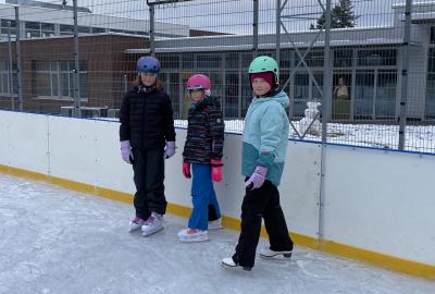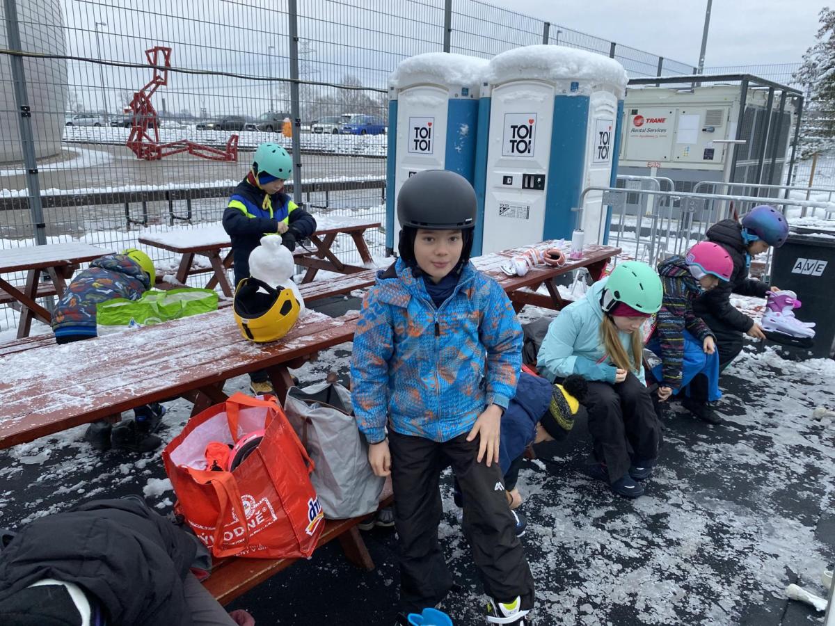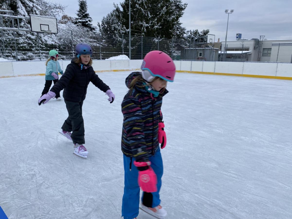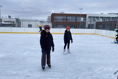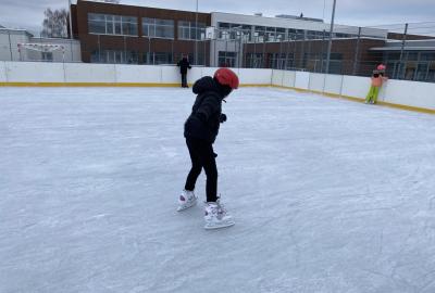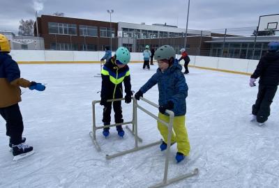 Část víceúčelového hřiště u školy se proměnila v kluziště, takže naše bruslařská výzbroj rozhodně nemohla zahálet.