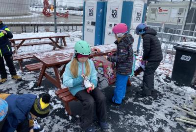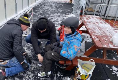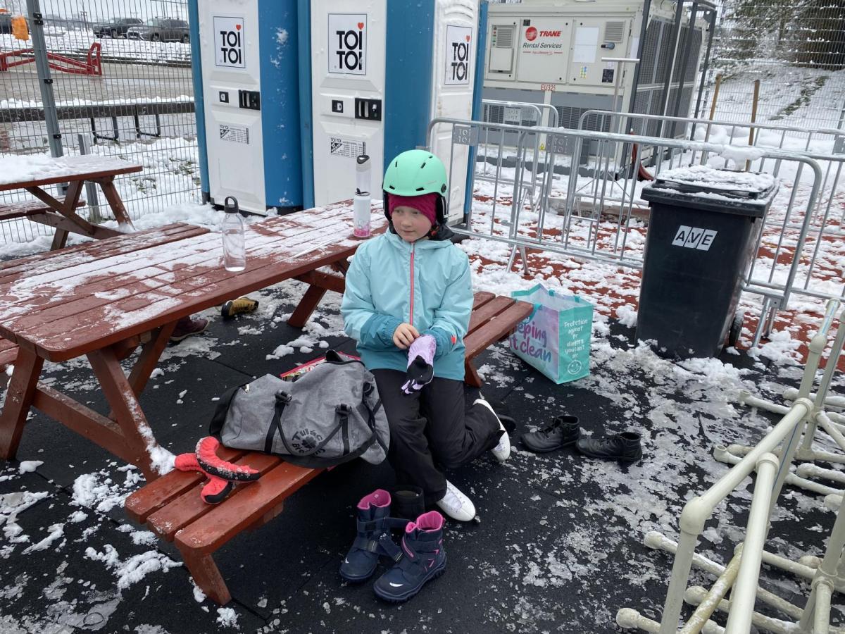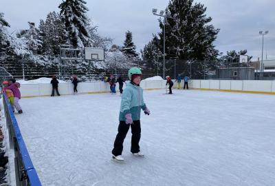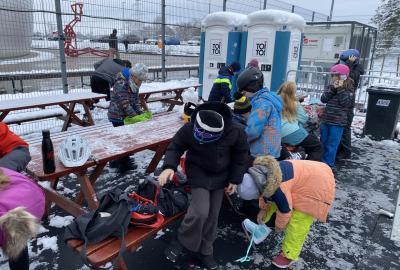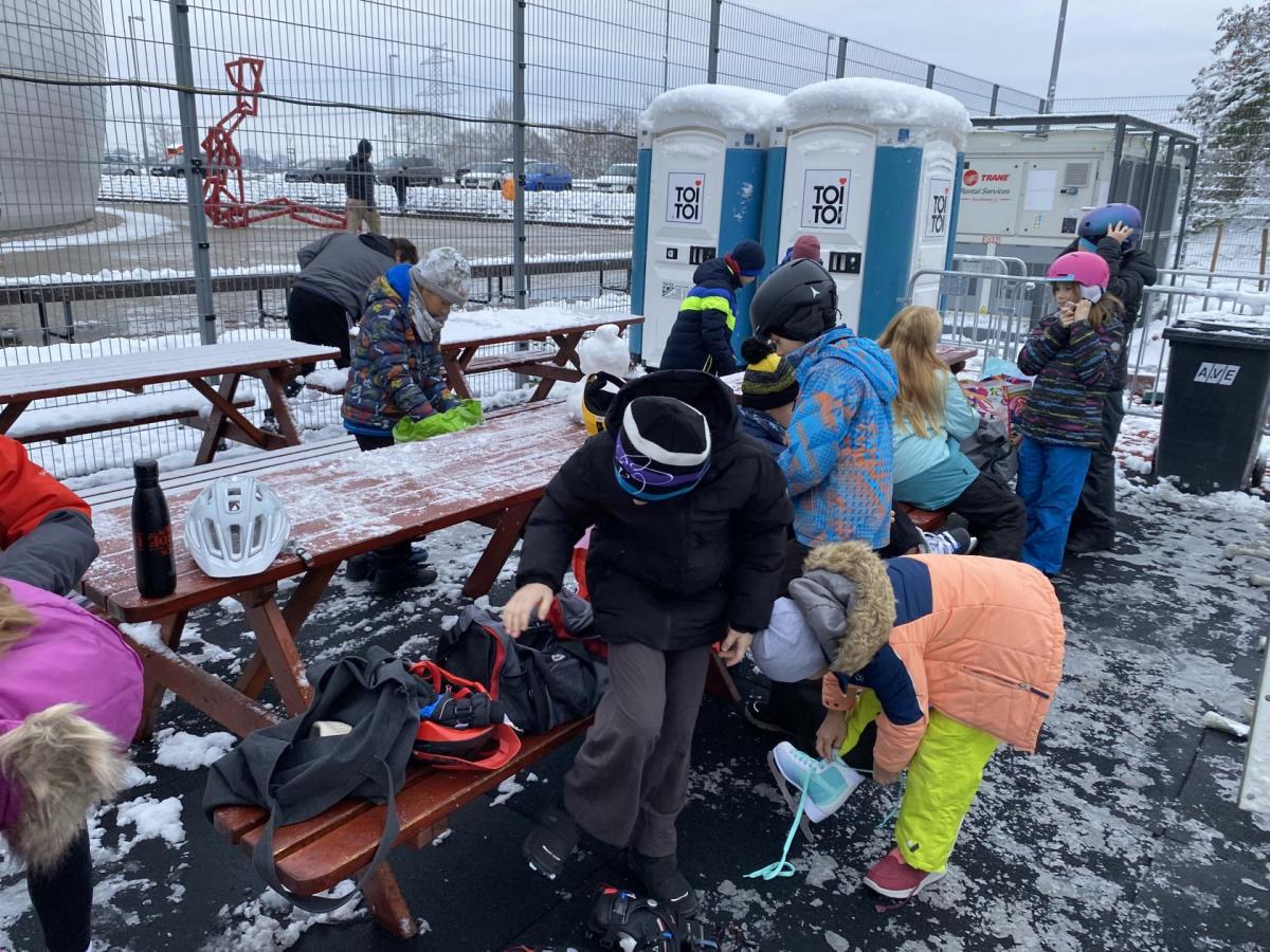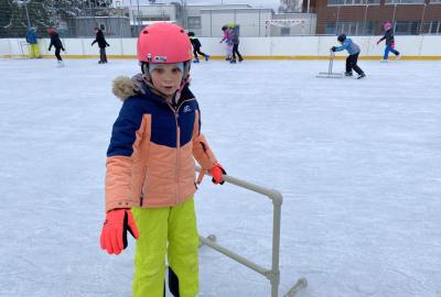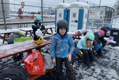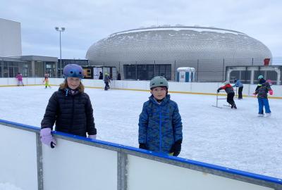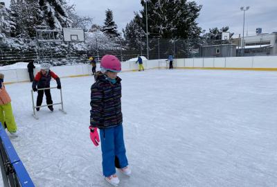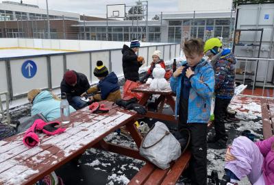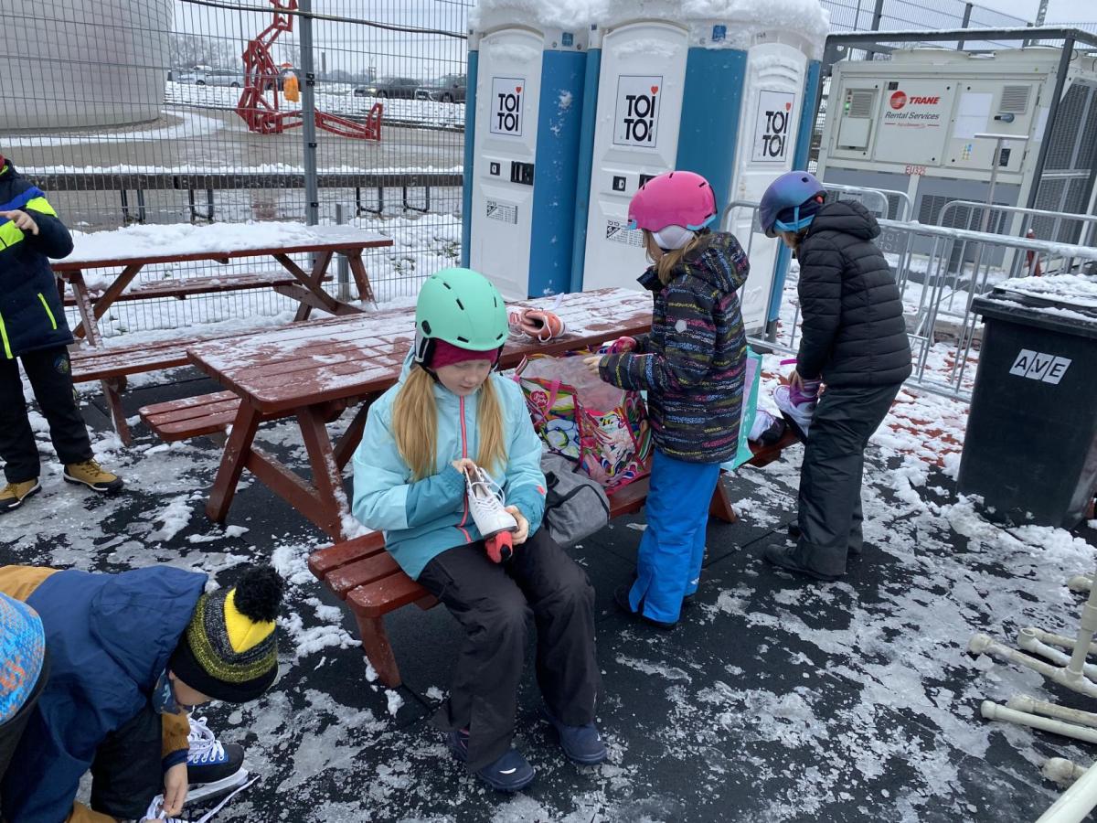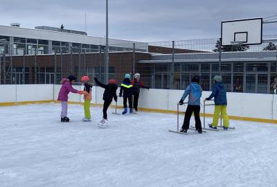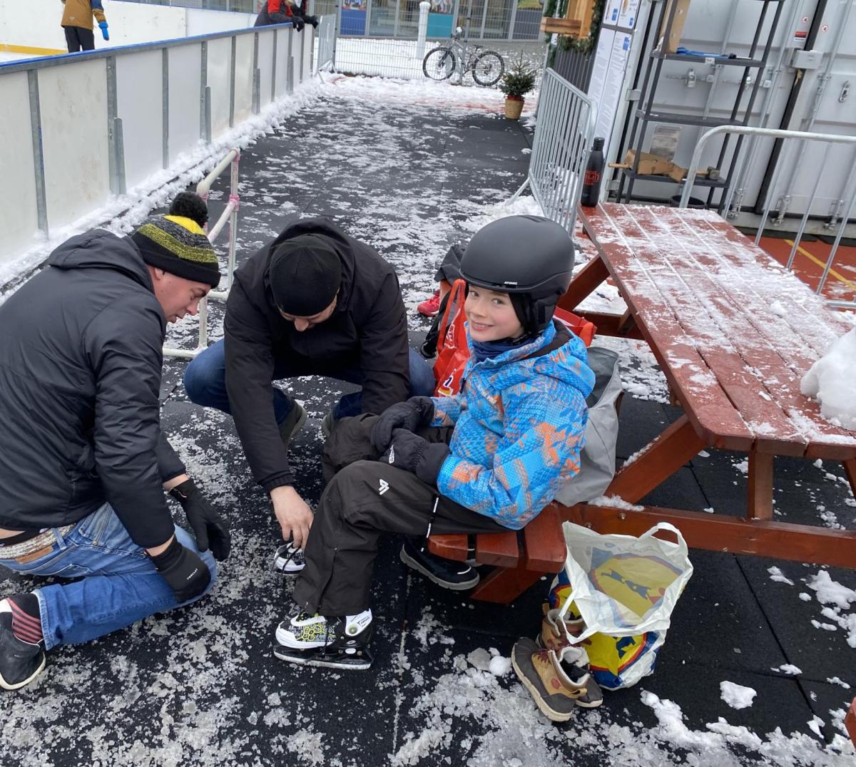 Část víceúčelového hřiště u školy se proměnila v kluziště, takže naše bruslařská výzbroj rozhodně nemohla zahálet.