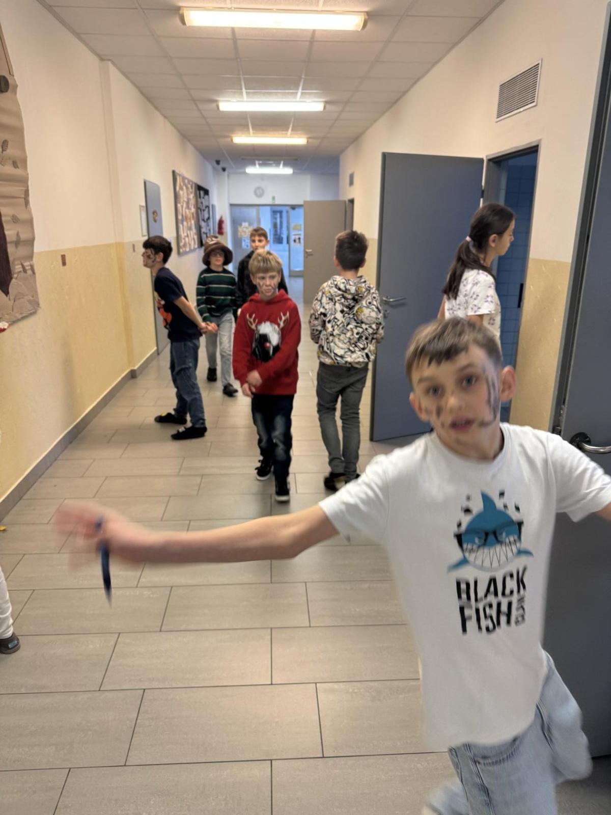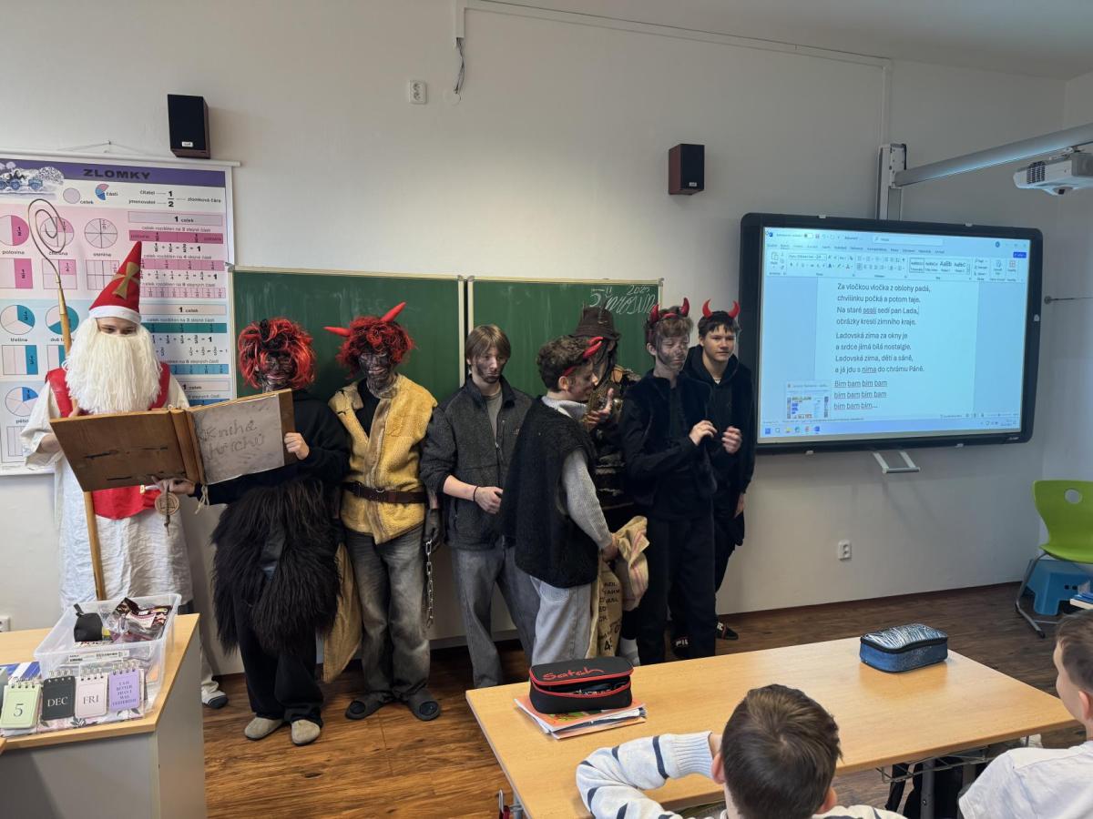 Mikuláš nakonec dorazil do 5.A až třetí hodinu. To už ve škole panoval pořádný rachot a páťáci byli napnutí jak struna. Mikuláš dorazil v doprovodu čertů a andělů a přečetl páťákům z knihy hříchů. Čerti se pokusili odnést některé naše žáky do pekla, ale všichni nakonec naštěstí unikli. Andělé dětem rozdali bonbóny. Páťáci zazpívali písničku Ladovská zima od Jaromíra Nohavici, kterou nacvičili v hodinách hudební výchovy.