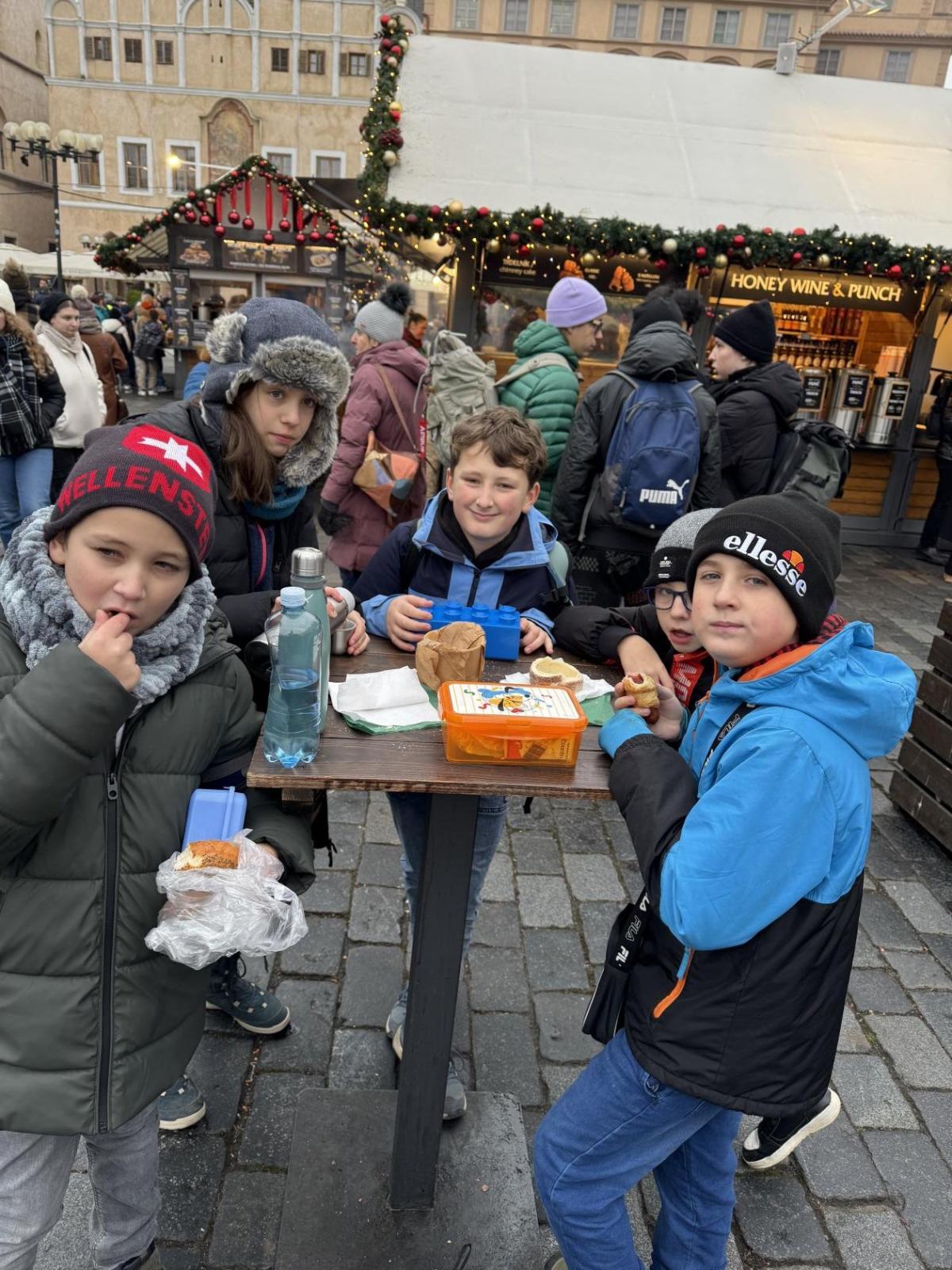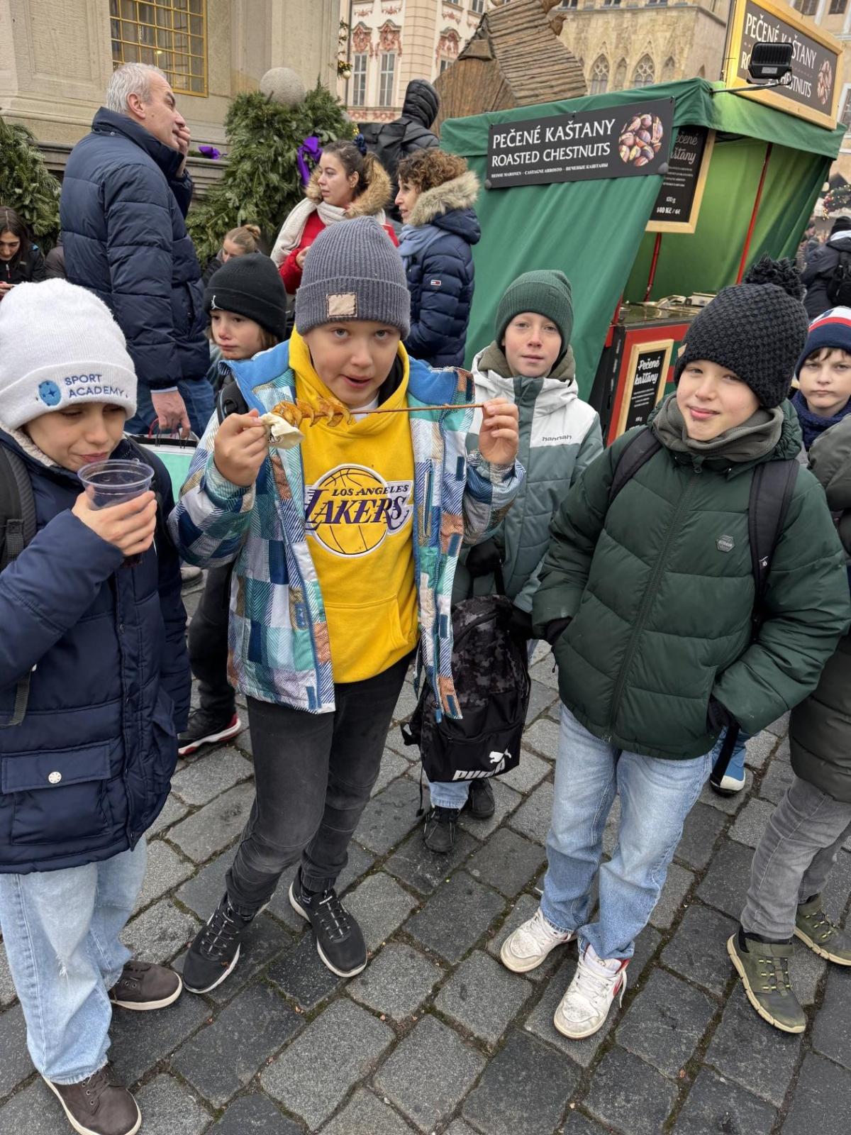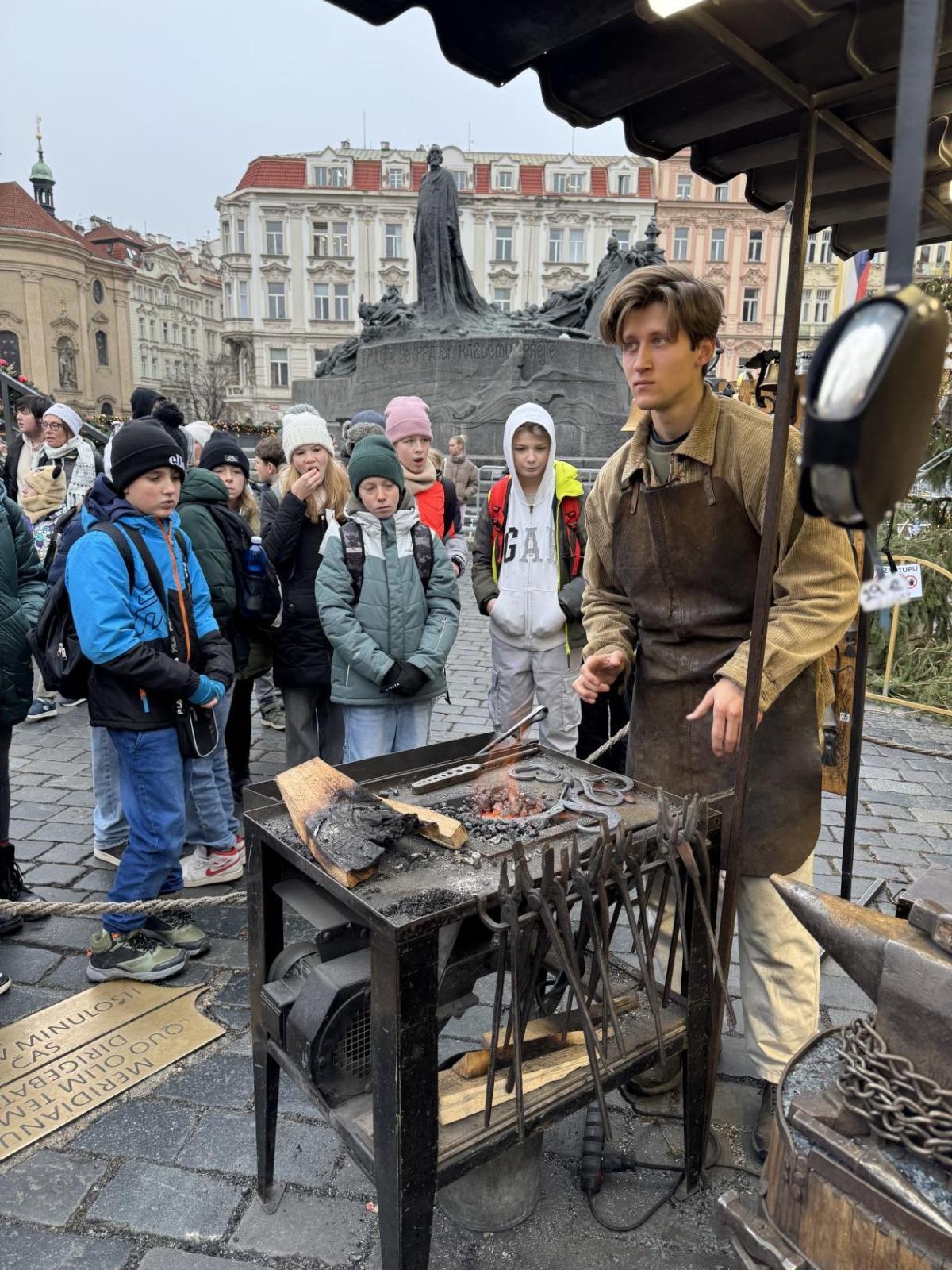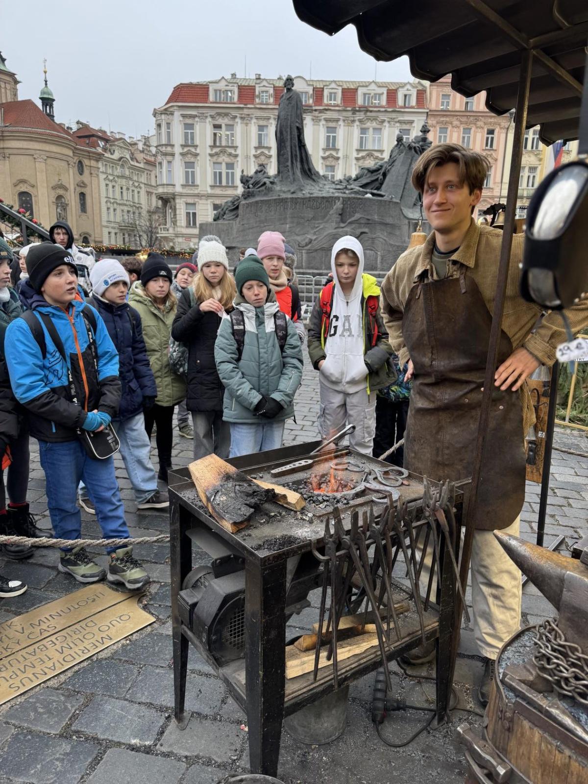Z Betlémské kaple se třída přesunula na Staroměstské náměstí, kde si děti dopřály tradiční trdelník, teplý ovocný nápoj nebo třeba čerstvé bramborové lupínky. Se zájmem sledovali počínání mistra kováře. Samozřejmostí byla prohlídka vánočního stromu.