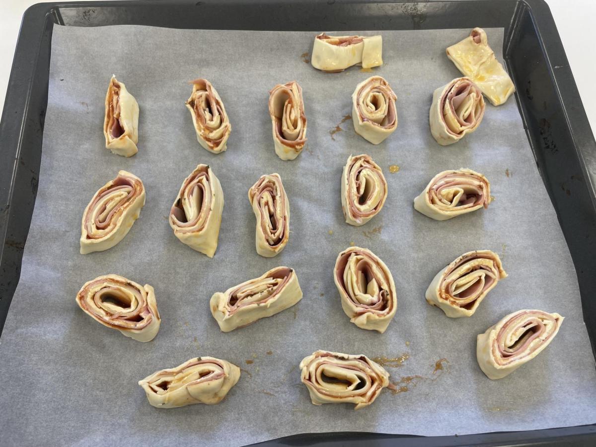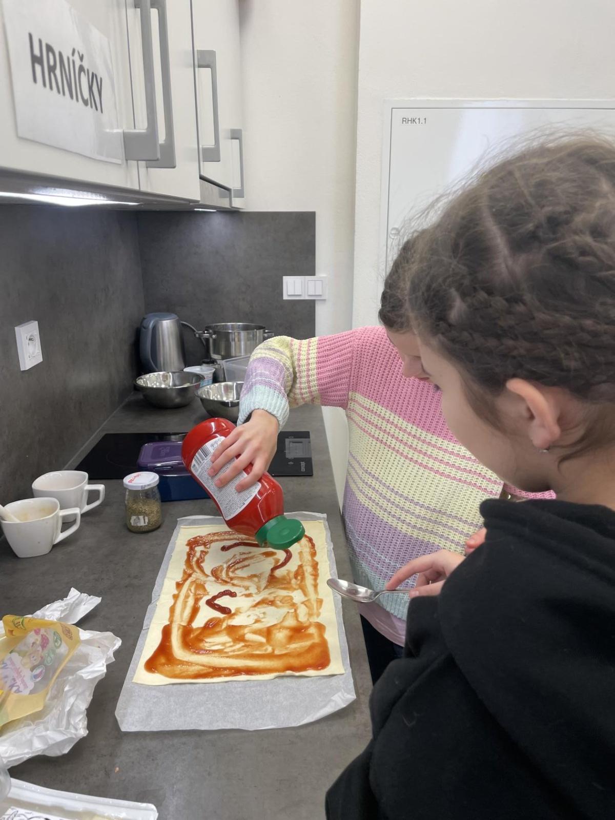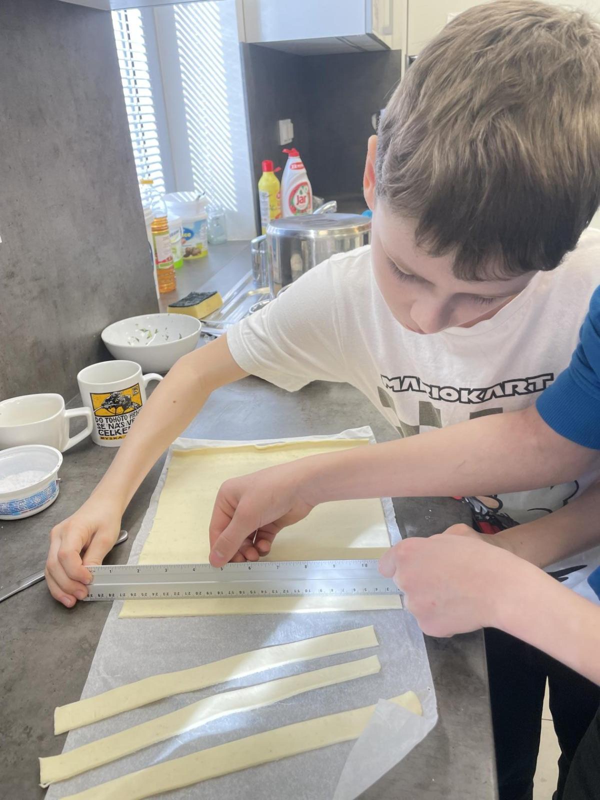 Listové těsto je velmi vděčné, samozřejmě to kupované. Připravit si těsto v kuchyňce, není z časových důvodů možné. Při přípravě kremrolí bylo nejdříve potřeba nakrájet z těsta stejně široké proužky. Kluci byli šikovní a vymysleli při přípravě proužků použít kovové pravítko ...a bylo hotovo. Natočit proužky na kovové trubičky, už byla jednoduchá práce. Plnění kremrolí bílkovým sněhem cukrářským sáčkem se zdobící špičkou, si vyzkoušely všechny děti. Jako slanou variaci z listového těsta připravila děvčata šneky.