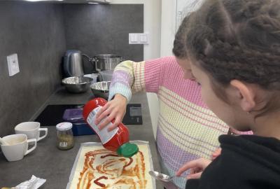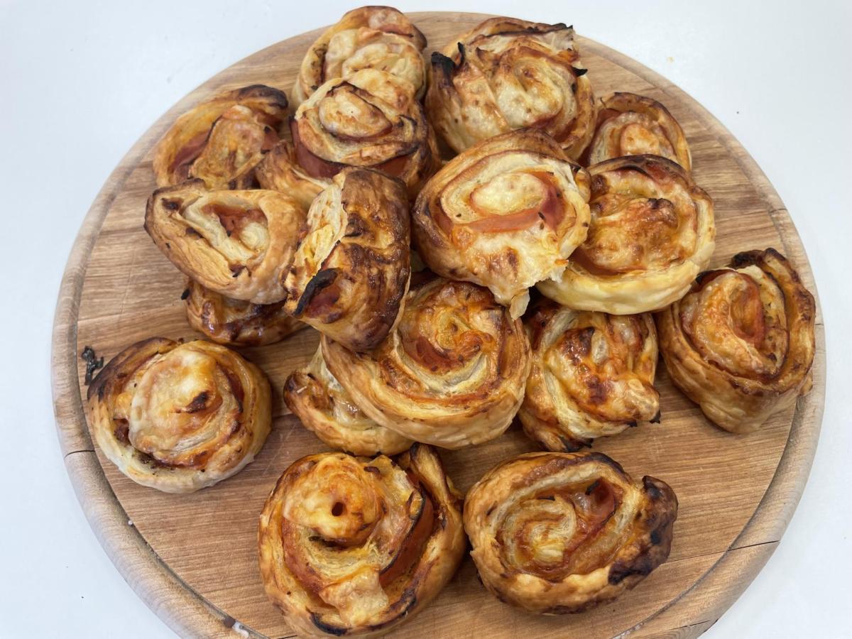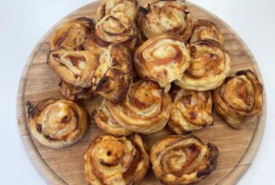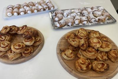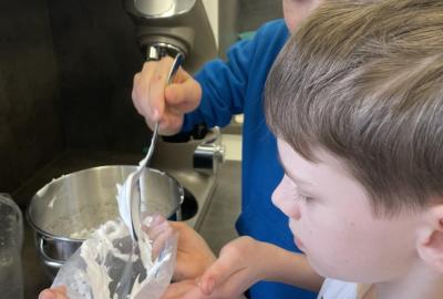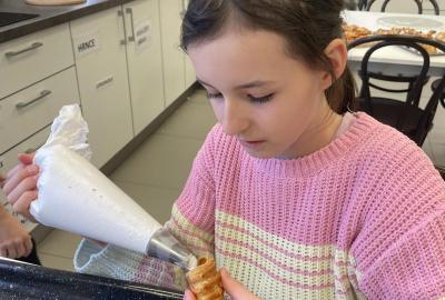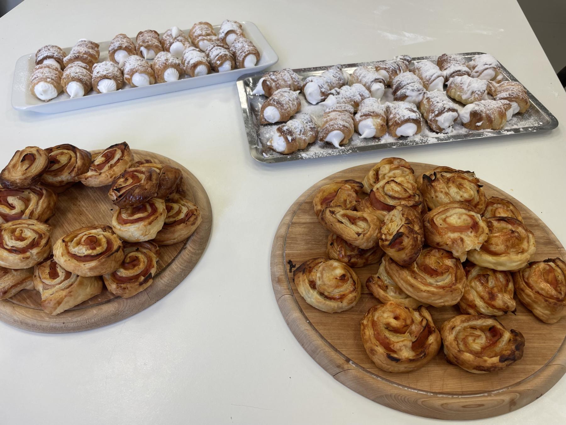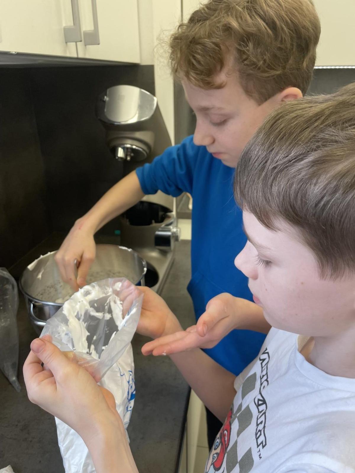 Listové těsto je velmi vděčné, samozřejmě to kupované. Připravit si těsto v kuchyňce, není z časových důvodů možné. Při přípravě kremrolí bylo nejdříve potřeba nakrájet z těsta stejně široké proužky. Kluci byli šikovní a vymysleli při přípravě proužků použít kovové pravítko ...a bylo hotovo. Natočit proužky na kovové trubičky, už byla jednoduchá práce. Plnění kremrolí bílkovým sněhem cukrářským sáčkem se zdobící špičkou, si vyzkoušely všechny děti. Jako slanou variaci z listového těsta připravila děvčata šneky.