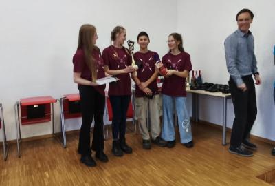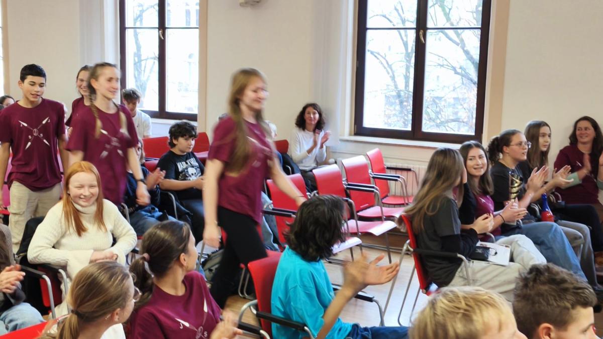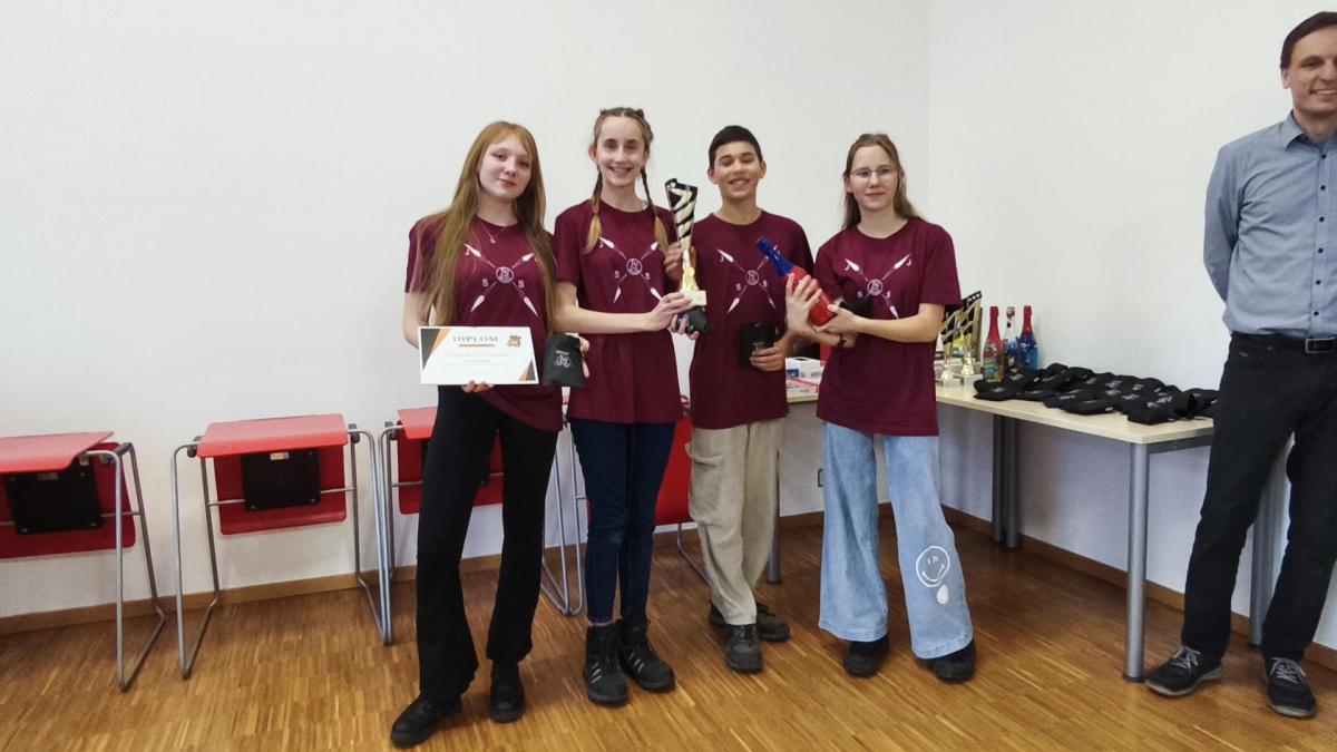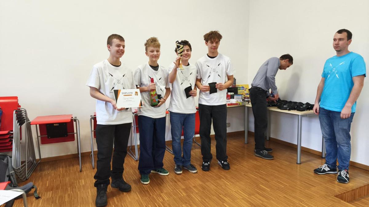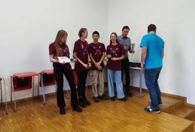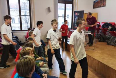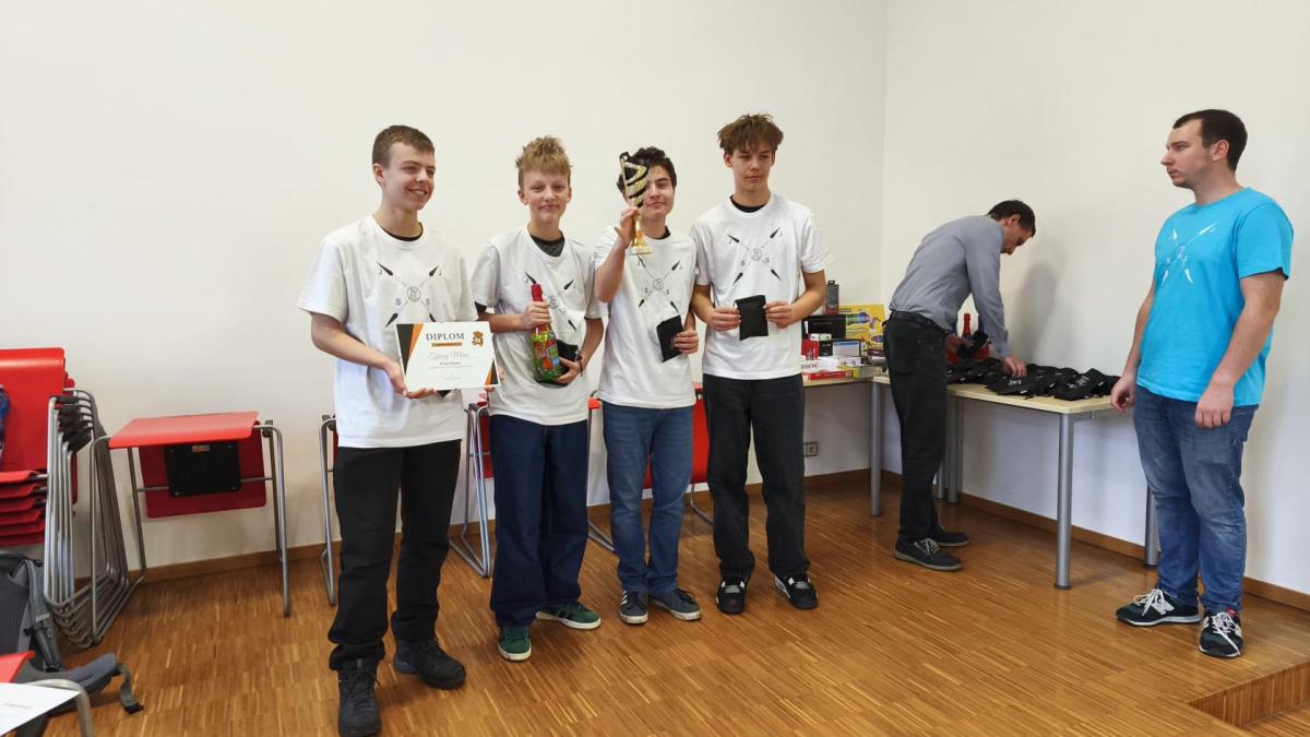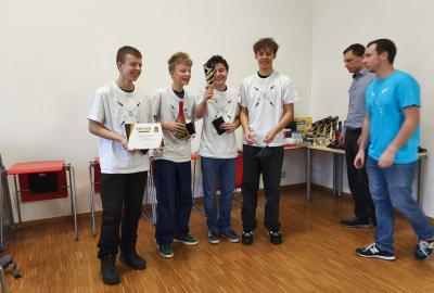 Ve středu jsme pak vyrazili na gymnázium Na Jarošce a po prezenci a objasnění pravidel už začala vlastní hra. Tým Metvětice & Gumítek (ve složení Anička Halbichová, Kačka Kopalová, Terka Voříšková a Vilém Havlíček) již od začátku hry dominoval a bylo jasné, že těm začátek hry lépe sednout nemohl. Naopak pro náš tým (ve složení Vojta Vrňata, Honza Škrob, Martin Řezníček a Jenda Kovařík) to nevypadalo první dvě hodiny vůbec ideálně, ale nakonec se nám za posledních 20 minut podařilo vyřešit neuvěřitelných 5 úloh za 16 bodů a povedlo se nám dotáhnout na stupně vítězů. Průběh soutěže byl totiž první dvě hodiny zveřejňován na tabuli v aule, kde jsme soutěžili. Na posledních 30 minut ale organizátoři vše vypnuli. Do závěrečného vyhlašování výsledků jsme tedy netušili, jak nakonec naše výprava dopadne. Tajně jsme doufali, že si jeden pohár odvezeme.