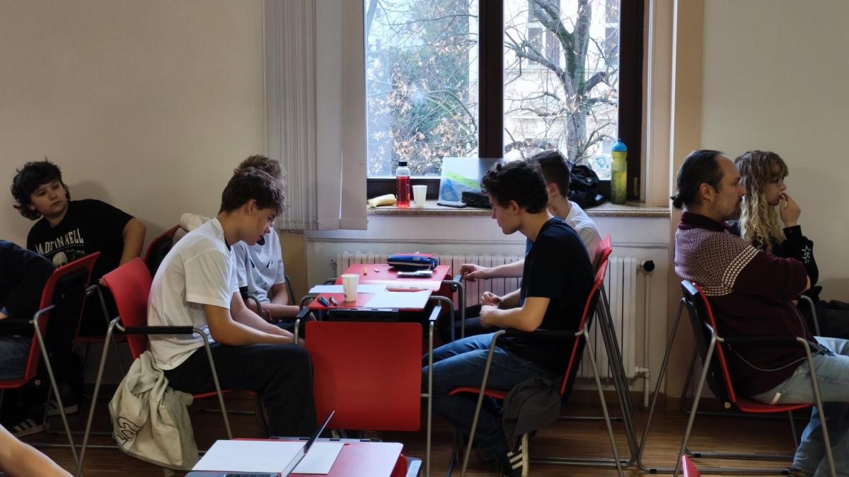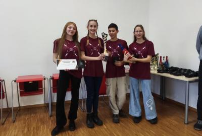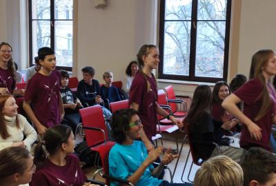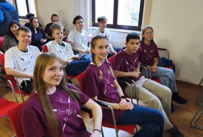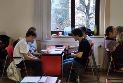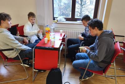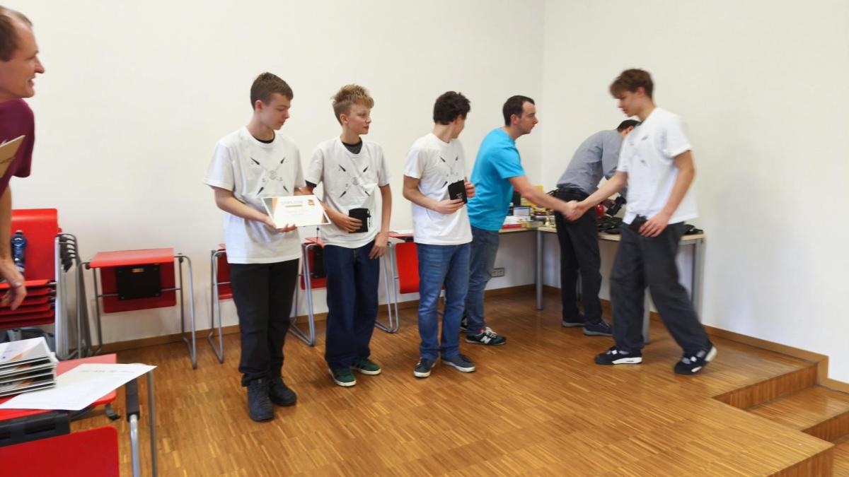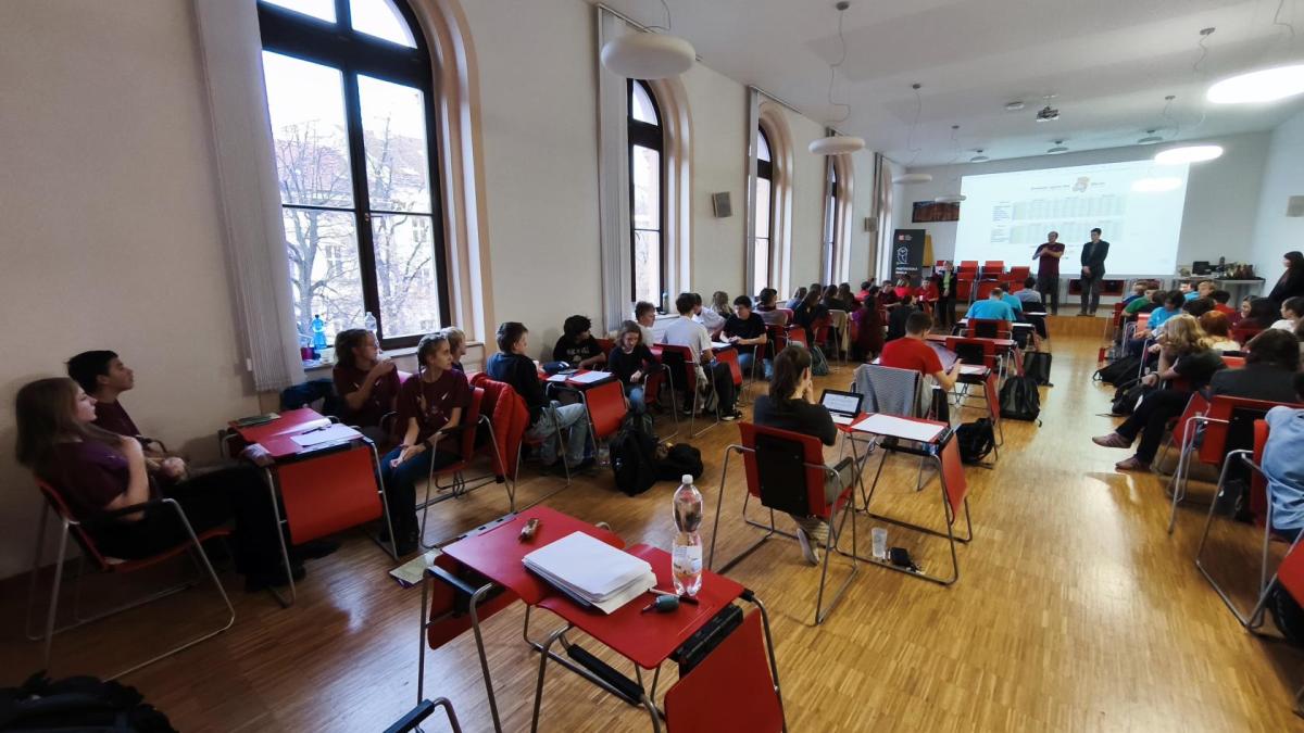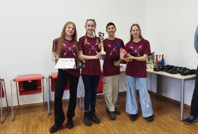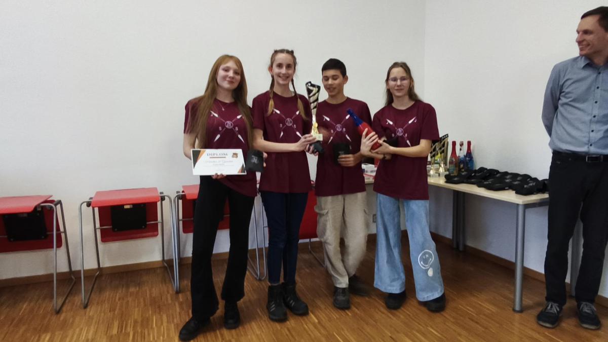 Ve středu jsme pak vyrazili na gymnázium Na Jarošce a po prezenci a objasnění pravidel už začala vlastní hra. Tým Metvětice & Gumítek (ve složení Anička Halbichová, Kačka Kopalová, Terka Voříšková a Vilém Havlíček) již od začátku hry dominoval a bylo jasné, že těm začátek hry lépe sednout nemohl. Naopak pro náš tým (ve složení Vojta Vrňata, Honza Škrob, Martin Řezníček a Jenda Kovařík) to nevypadalo první dvě hodiny vůbec ideálně, ale nakonec se nám za posledních 20 minut podařilo vyřešit neuvěřitelných 5 úloh za 16 bodů a povedlo se nám dotáhnout na stupně vítězů. Průběh soutěže byl totiž první dvě hodiny zveřejňován na tabuli v aule, kde jsme soutěžili. Na posledních 30 minut ale organizátoři vše vypnuli. Do závěrečného vyhlašování výsledků jsme tedy netušili, jak nakonec naše výprava dopadne. Tajně jsme doufali, že si jeden pohár odvezeme.