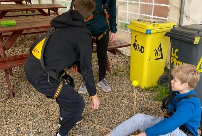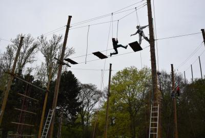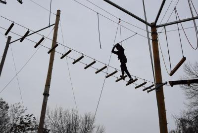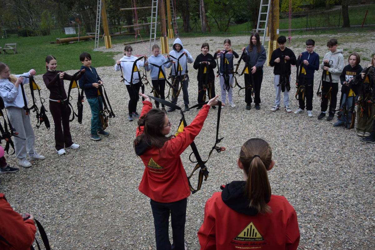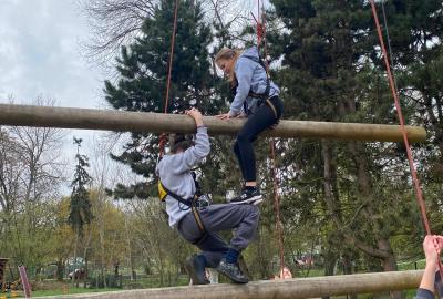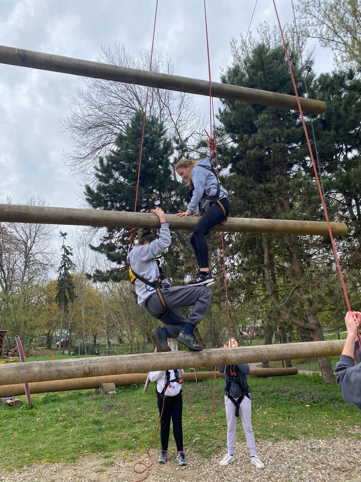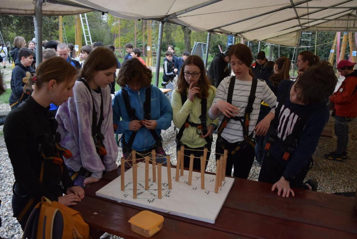 Následně jsme se rozdělili do předem připravených šestičlenných skupin a v nich vytvořili dvě trojice. Vždy jeden lezl a zbylí dva jistili. Nejprve jsme si mohli vyzkoušet zdolávání překážek v malé výšce, poté nás ale čekala skutečná výzva. Překážky byly umístěny mezi kůly asi 10 metrů nad zemí. Za každý úsek, který daná trojice přelezla bez obtíží, získal tým body. Při zdolávání některých překážek byla třeba spolupráce celého týmu, protože si lezci museli vzájemně pomáhat.