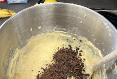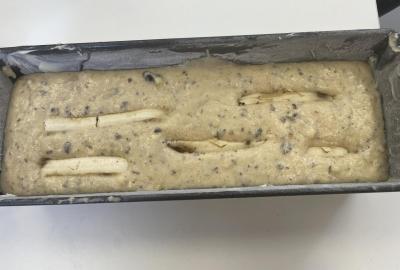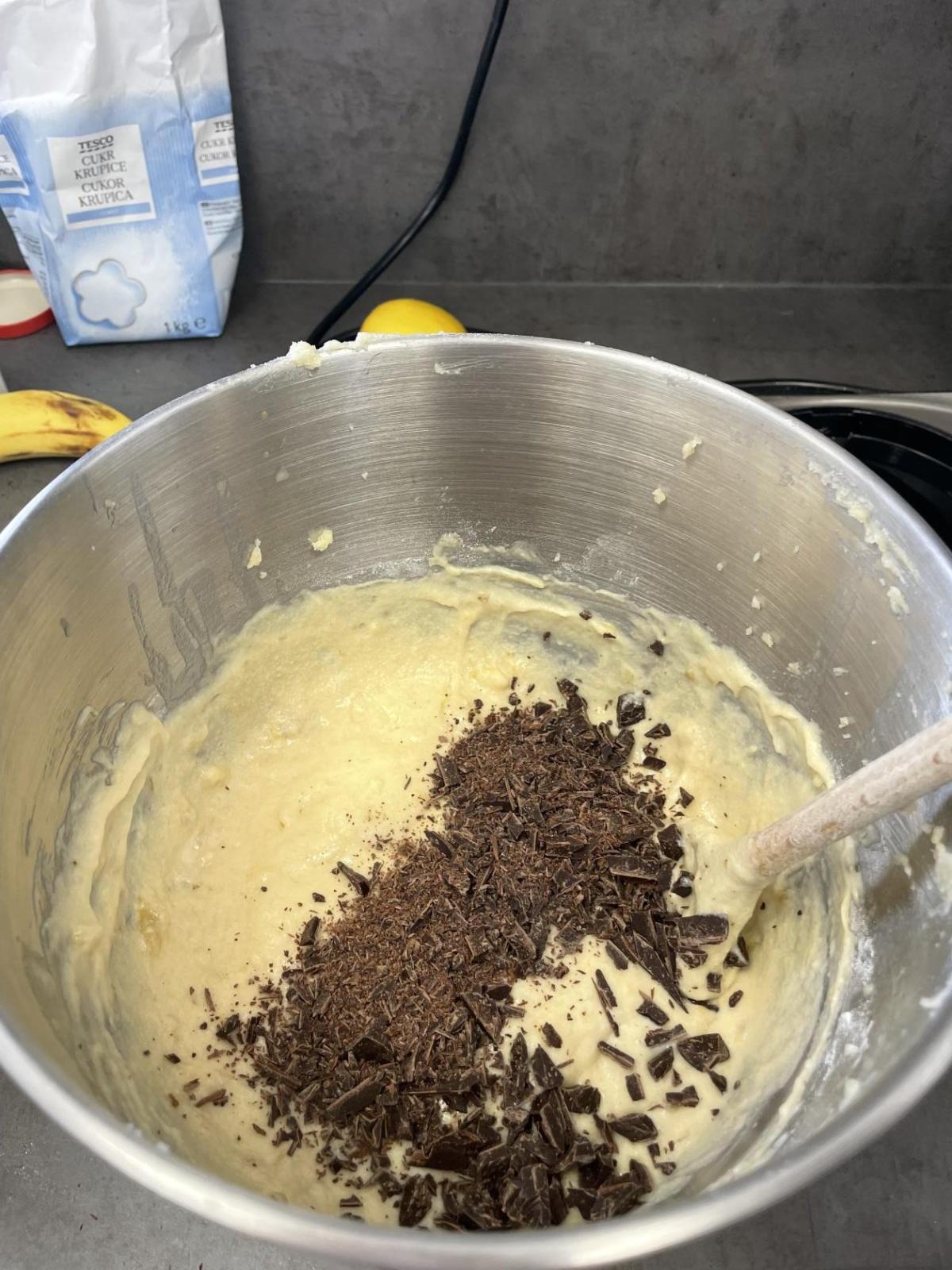 kuřecí špízy, bramboráky, zeleninová obloha, banánový chlebíček