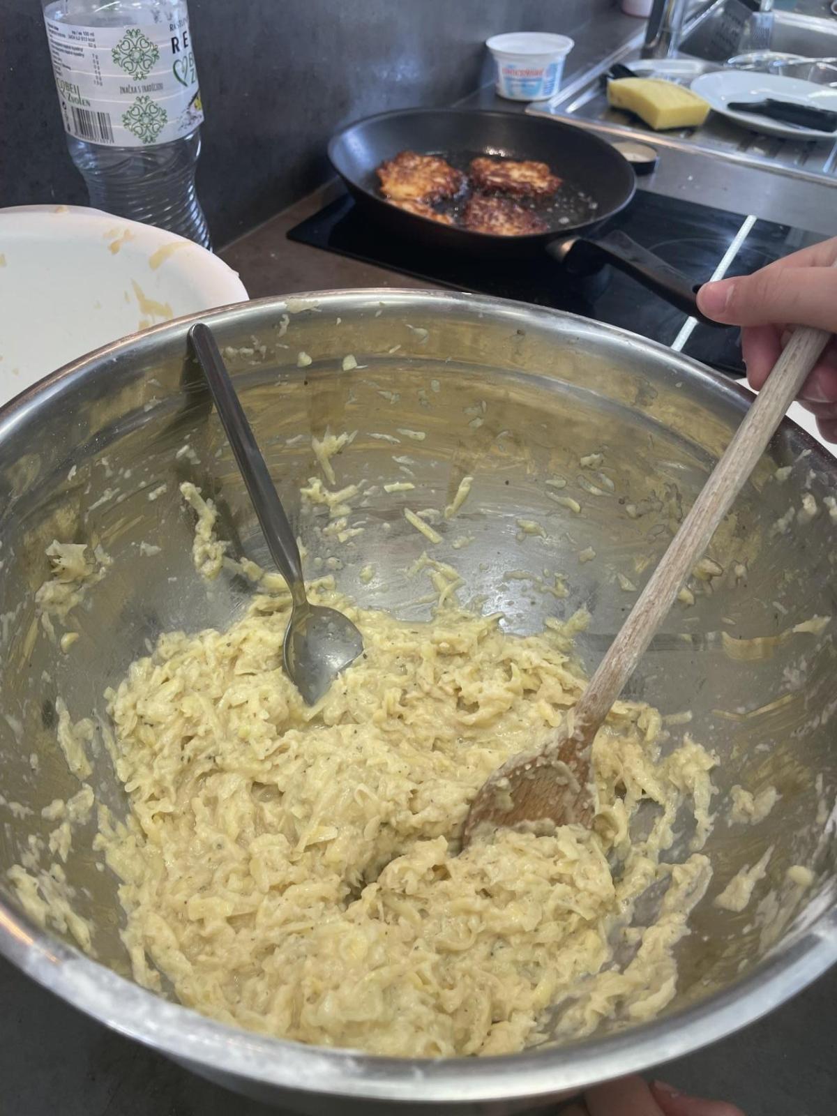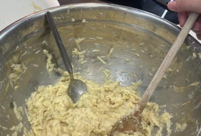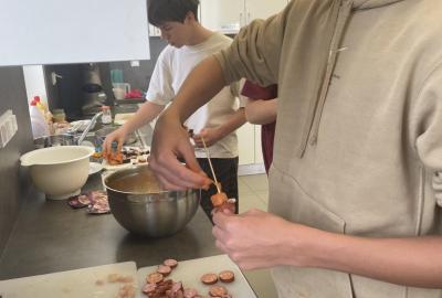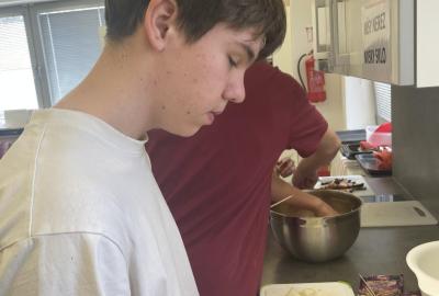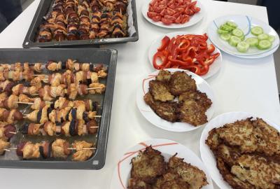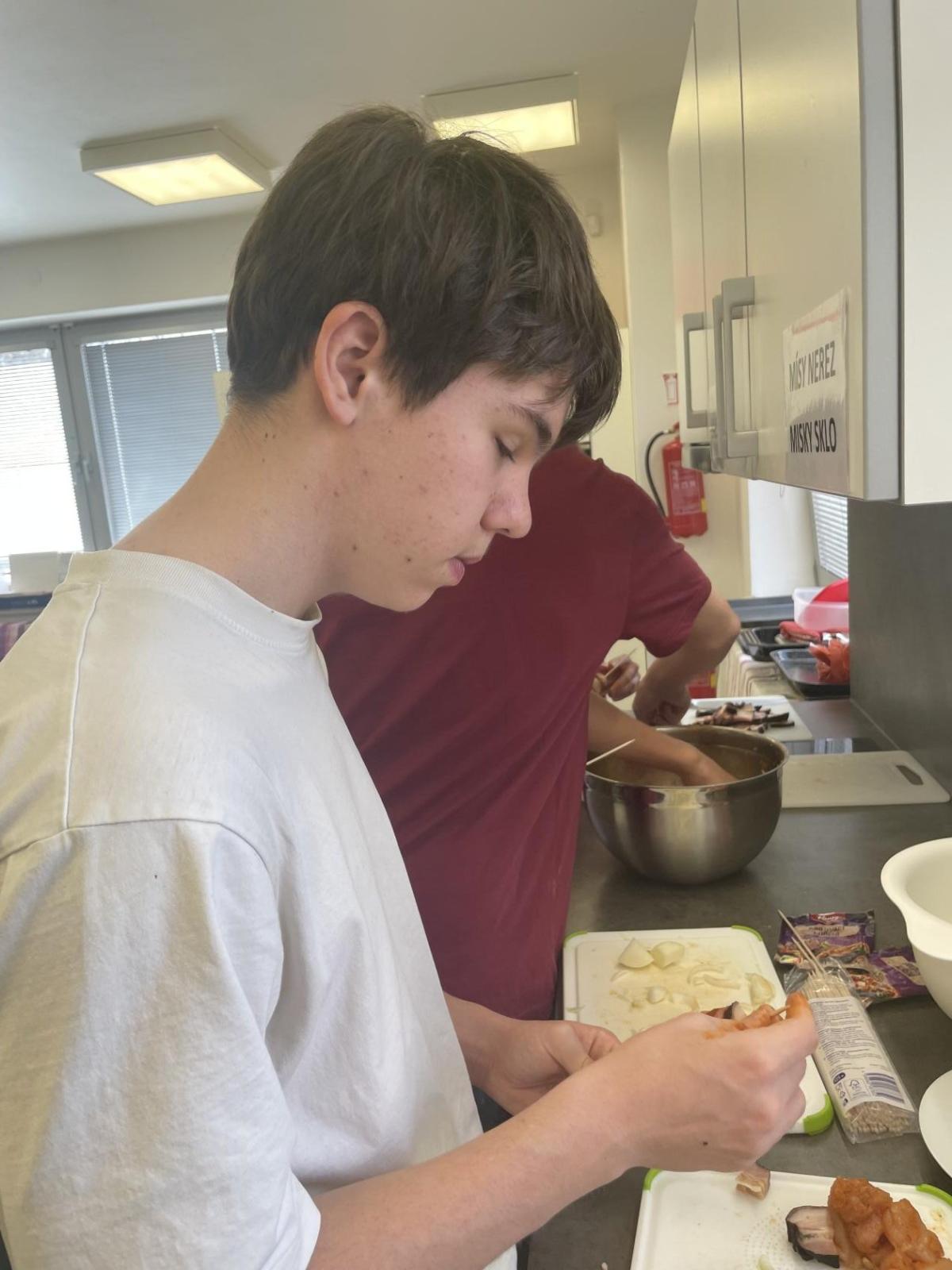 Maso rádi připravuji chlapci, takže krájeli maso, klobásu, anglickou slaninu a cibuli, aby připravené suroviny střídavě napichovali na špejle. Špízy pak upekli v troubě. Děvčata vytvořila z brambor a všech ingrediencí těsto na bramboráky.