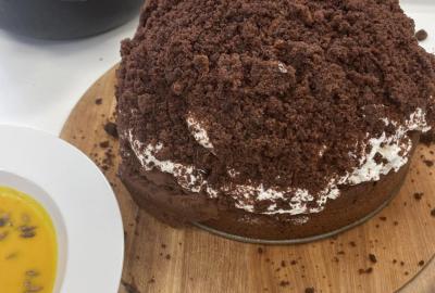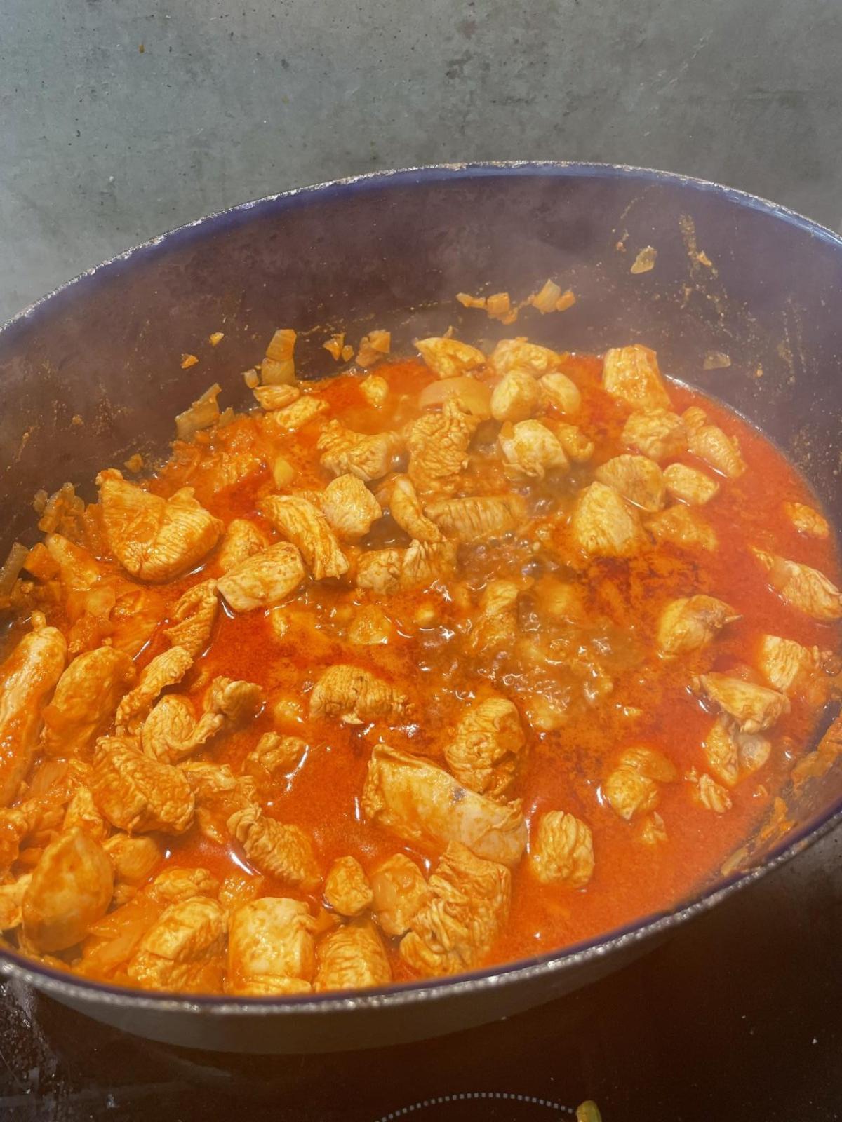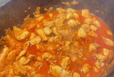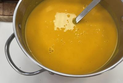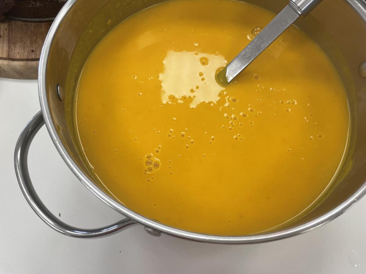 Dýňová polévka, kuřecí na paprice s těstovinami, Krtkův dort, batáty, banánový šejk