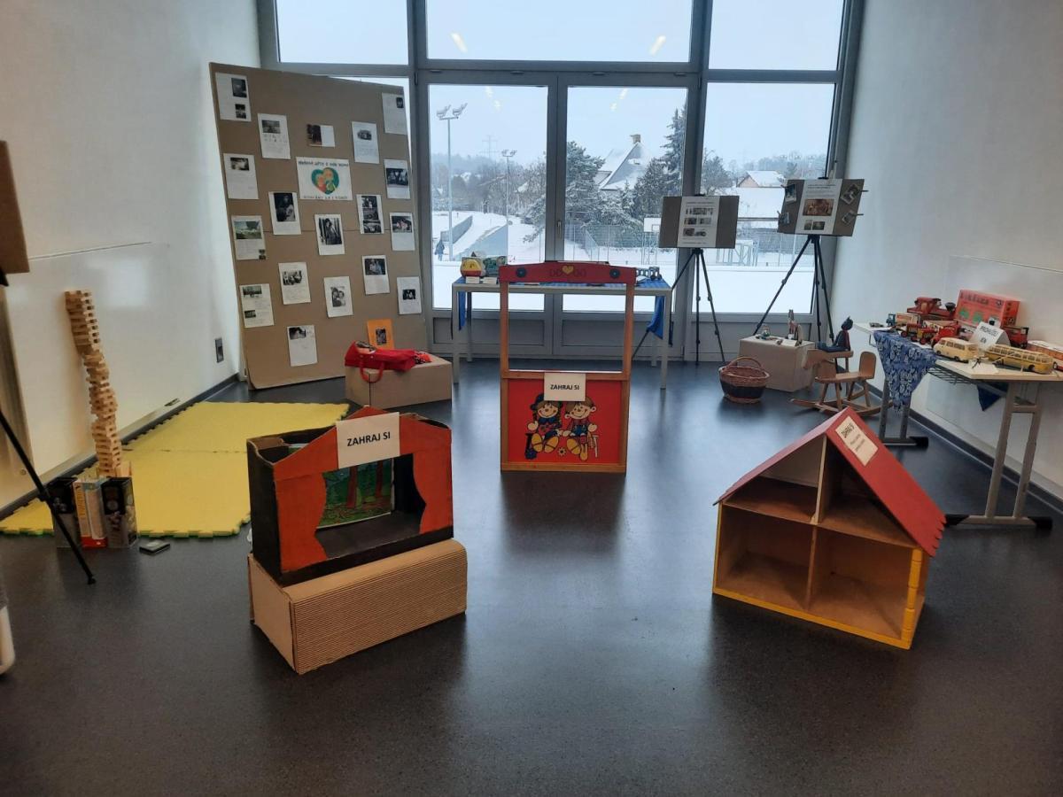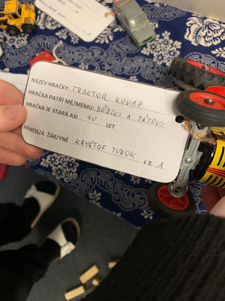 Na výstavě si mohli návštěvníci prohlédnout mončičáky, panenky, traktůrky a také divadlo s loutkami. Mimo hračky zde byly i hlavolamy, slabikáře a velice oblíbená stavebnice našich rodičů Merkur. Děti na výstavu přinesly spousty hraček. Například Kryštof z 2.A přispěl mončičákem a traktůrkem, které měl doma u dědečka. Aleš z 2.C přinesl malé indiánky. Většina dětí pak nosila mončičáky nebo panenky, jež měli jejich rodiče doma.